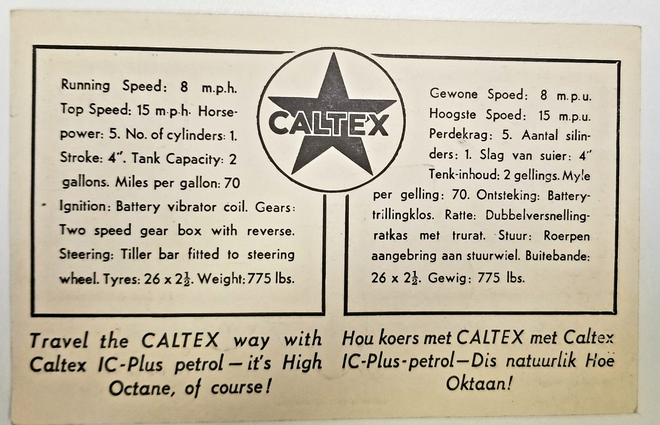 Stuart Halsall bought the Covert from Fred in 1979, and research revealed that it was a 1901model fitted with a single-cylinder 6 hp petrol engine, number 14. So, little wonder that Caltex made marketing mileage out of this remarkable feat, but one wonders where it got the Covert’s age wrong…