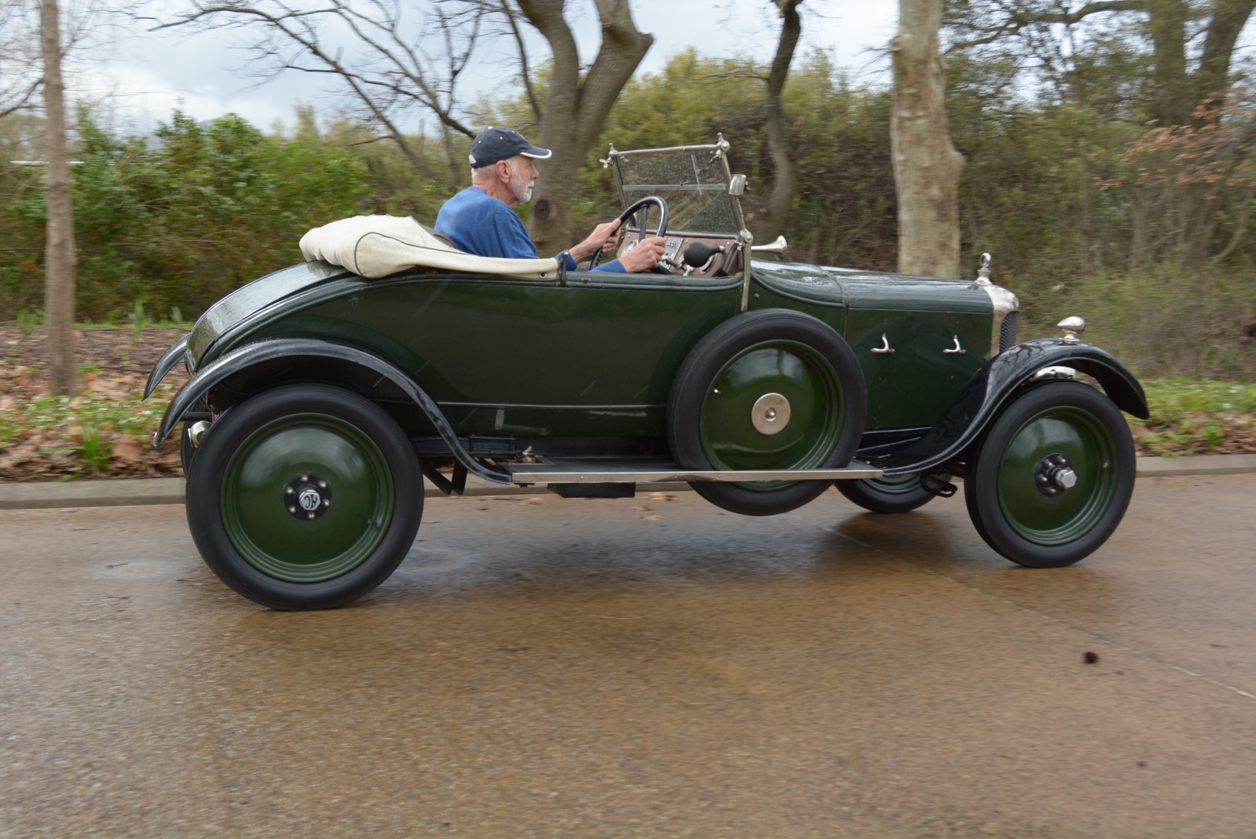 With a surprisingly roomy dickey seat, this tourer qualifies as a 2+2. Entering by the single, passenger-side door and sliding across the leather bench seat, the cockpit is spacious. The simple three-spoke steering wheel is nicely angled, and the pedals are conventionally laid out. Controls and instruments are randomly laid out across the wooden dashboard. A handbrake stands vertically next to the side panel, and alongside is the gear lever nestling in a stout, back-to-front ‘H’ gate – first and reverse are to the right, second and third to the left. Depress the floor-mounted starter button and the Anzani four springs into life without much ado, pulling away with ease. Second gear soon gets the AC up to speed and is the key ratio because there is quite a big jump to top gear.