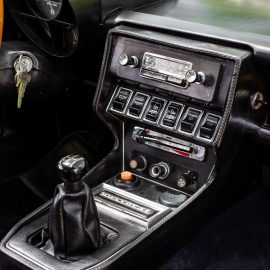 In front of the driver there is a comprehensive set of gauges and warning lights housed in two circular dials. The speedo reads to 260 km/h and the tachometer to 9 000 r/min, red-lined at 6 500. Tow column stalks on the left-hand side operate the indicators and headlamps, the latter twisted to release the vacuum-operated eyebrows over the quad headlights. A row of rocker switches on the hangdown centre console operate functions including the ventilation system, windows and wipers. Oh, a period radio is also set into the console.