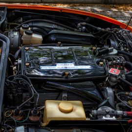 While the prototypes were fitted with Alfa’s legendary 1600c twin-cam engine, Alfa’s technicians were looking at fitting the 90-deg V8 engine from the Alfa 33 Stradale sports racing car into the striking coupé. The installation required some bodywork changes to accommodate the bigger motor, which was increased in capacity from 1995cc to 2593cc. The quad-cam engine featured electronic ignition, Spica mechanical fuel injection and dry sump lubrication, and with a 9,3:1 compression ratio delivered an even 200 hp (149 kW) at 6 500 r/min and 235 N.m of torque at 4 750 r/min..While a six-speed gearbox was used for the two-litre 33, the Montreal was fitted with a five-speed ZF transmission.