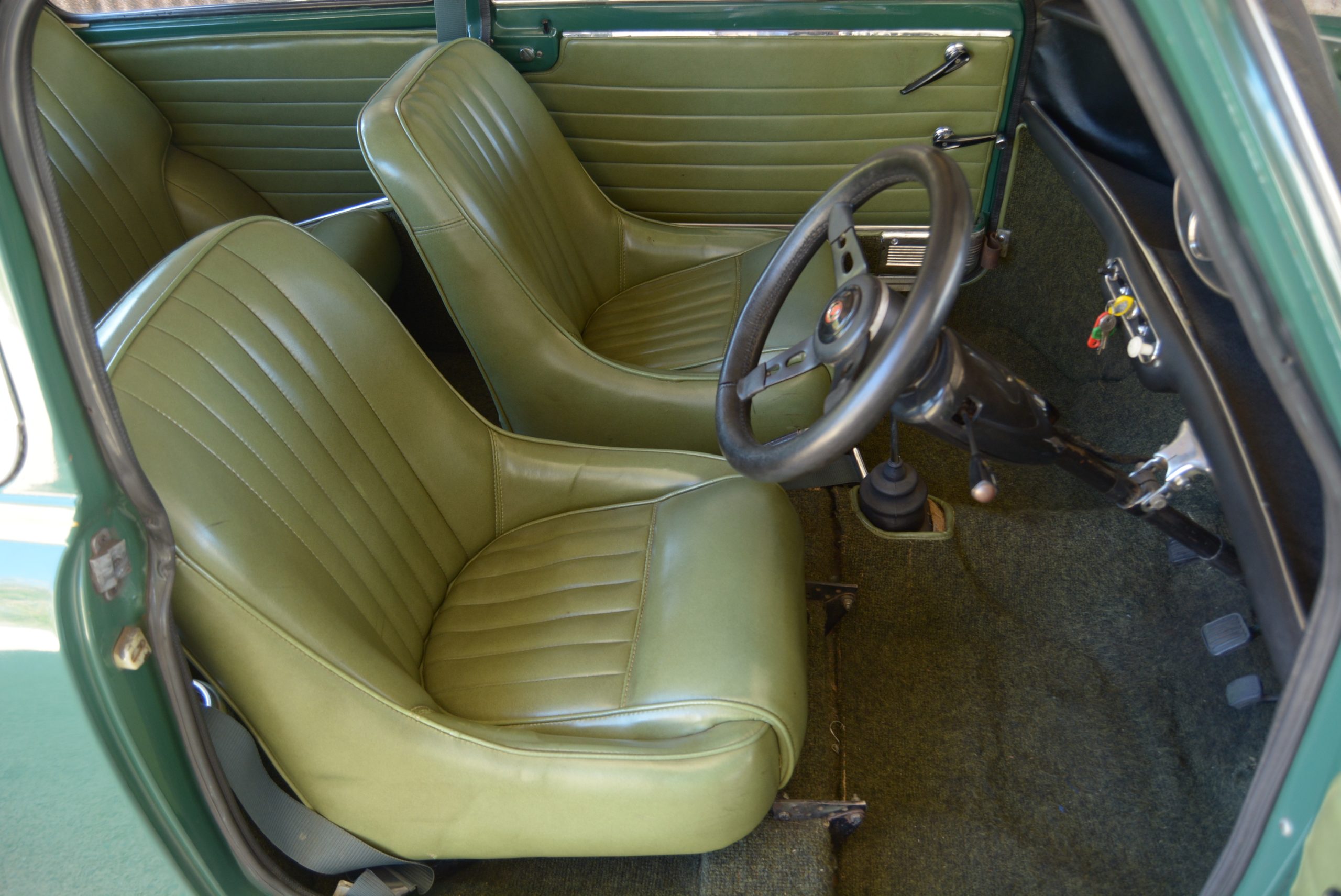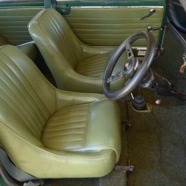 This car also has a claim to fame. Sports Car Club of SA badging on the fenders is testimony to the fact that at some point this car achieved 104,251 mph (167,775 km/h) at a top speed day held at the old Kyalami. Today, the car still has plenty of go and brings a smile to the faces of everyone who drives it. Although the gearshift is a bit clunky (early Mini remote shifts were renowned for being problematic), frequent cog swopping to keep the motor buzzing is not really necessary. The Mini’s legendary roadholding is so good that tackling bends requires only occasional lifting off the accelerator – the Mini’s inherent balance is superb. What is a surprise is how relatively soft the ride is on the fluid-based Hydrolastic rubber-cone suspension that was invented by British rubber engineer Alex Moulton. Remember the Moulton bicycle of the ’60s?