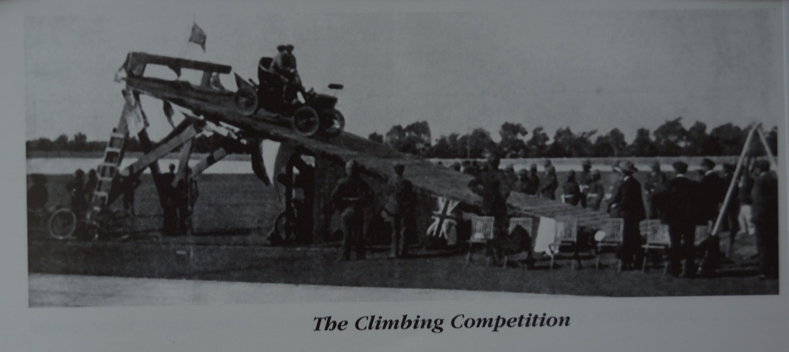 Two three-mile heats for Small Cars up to 6 hp began at 15h15, which were followed by another 5-mile handicap for Motor Bicycles. Then at 16h00 there was a Climbing Competition in which cars had to drive up, stop and start on a large inclined ramp that was adjusted to create slopes of 1:10, 1:8, 1:6 and 1:3. Many cars went up in reverse…