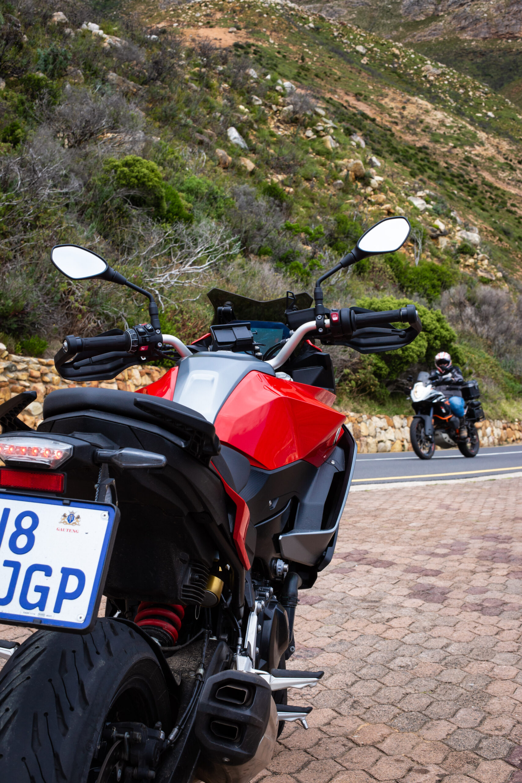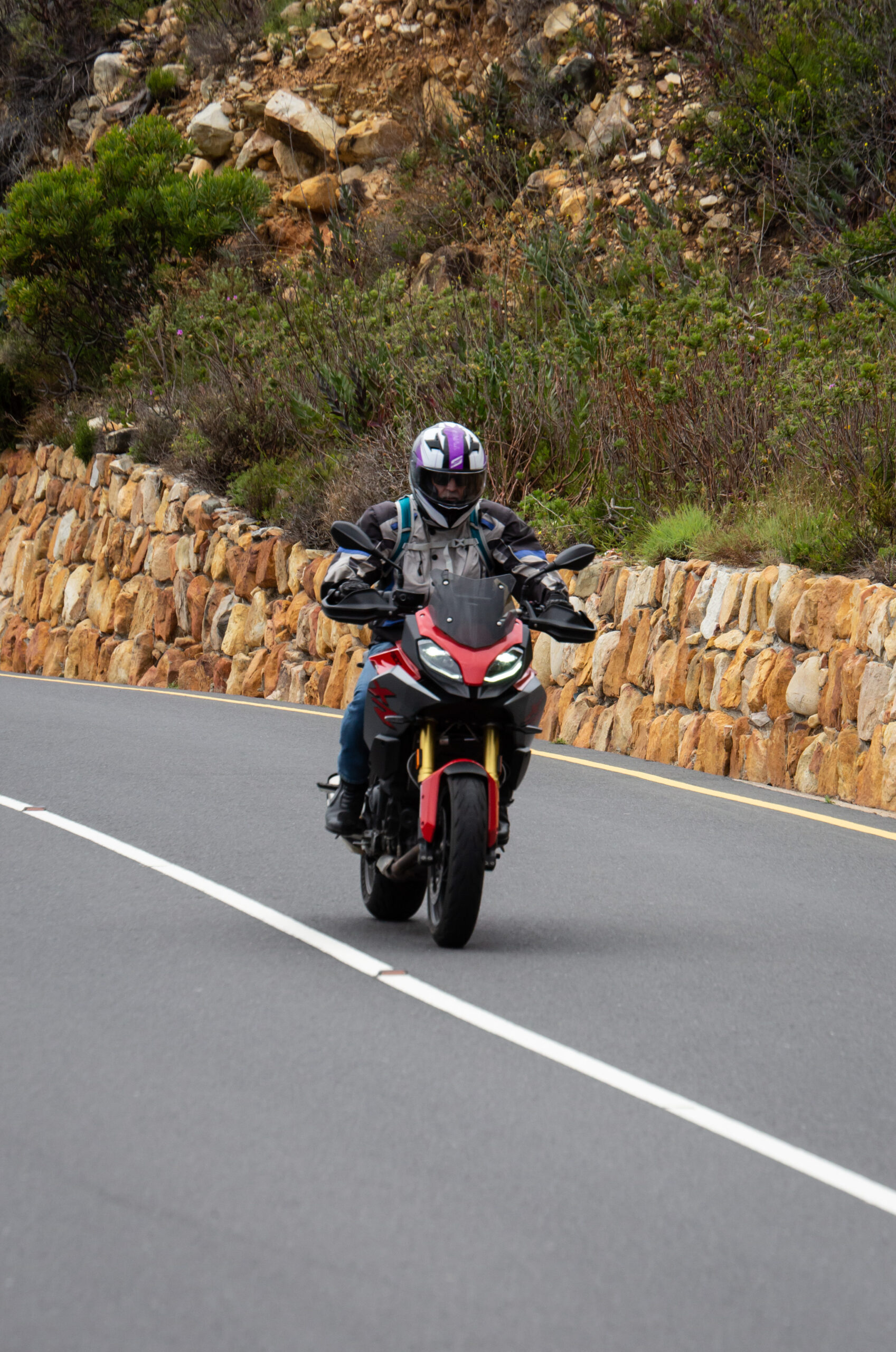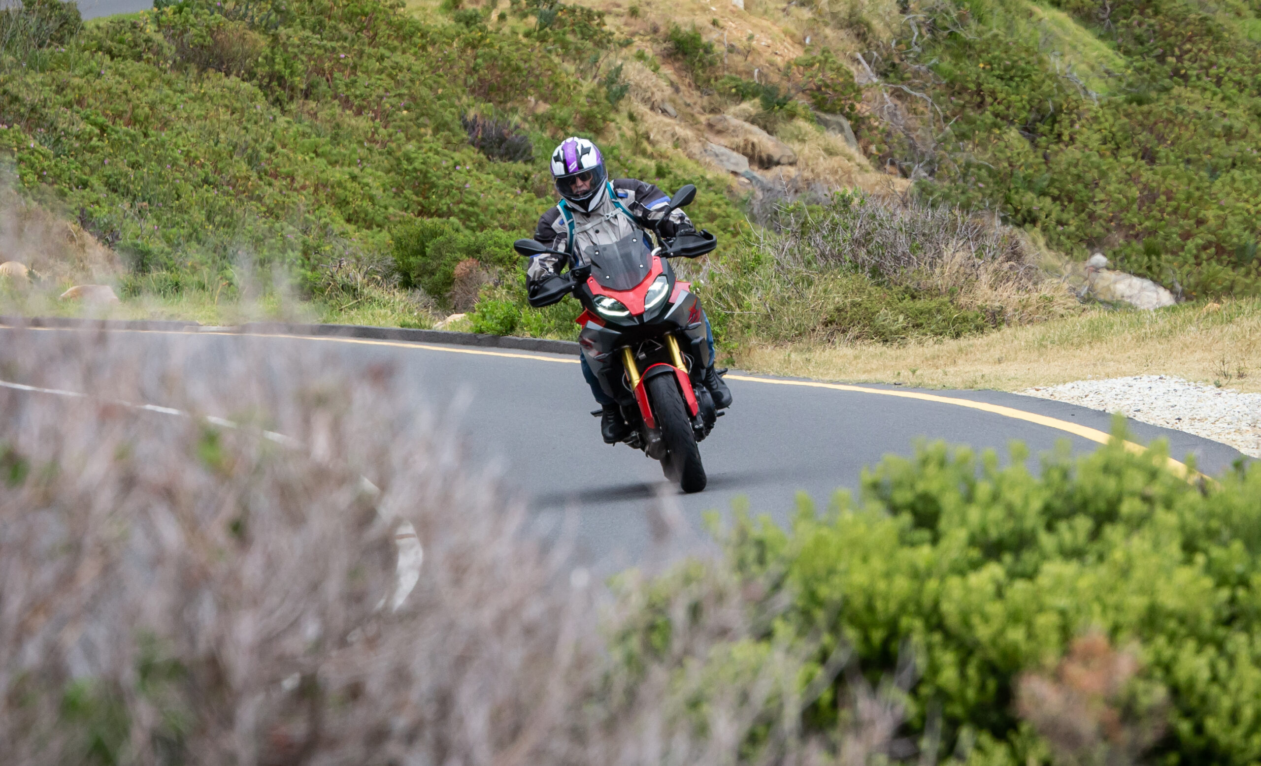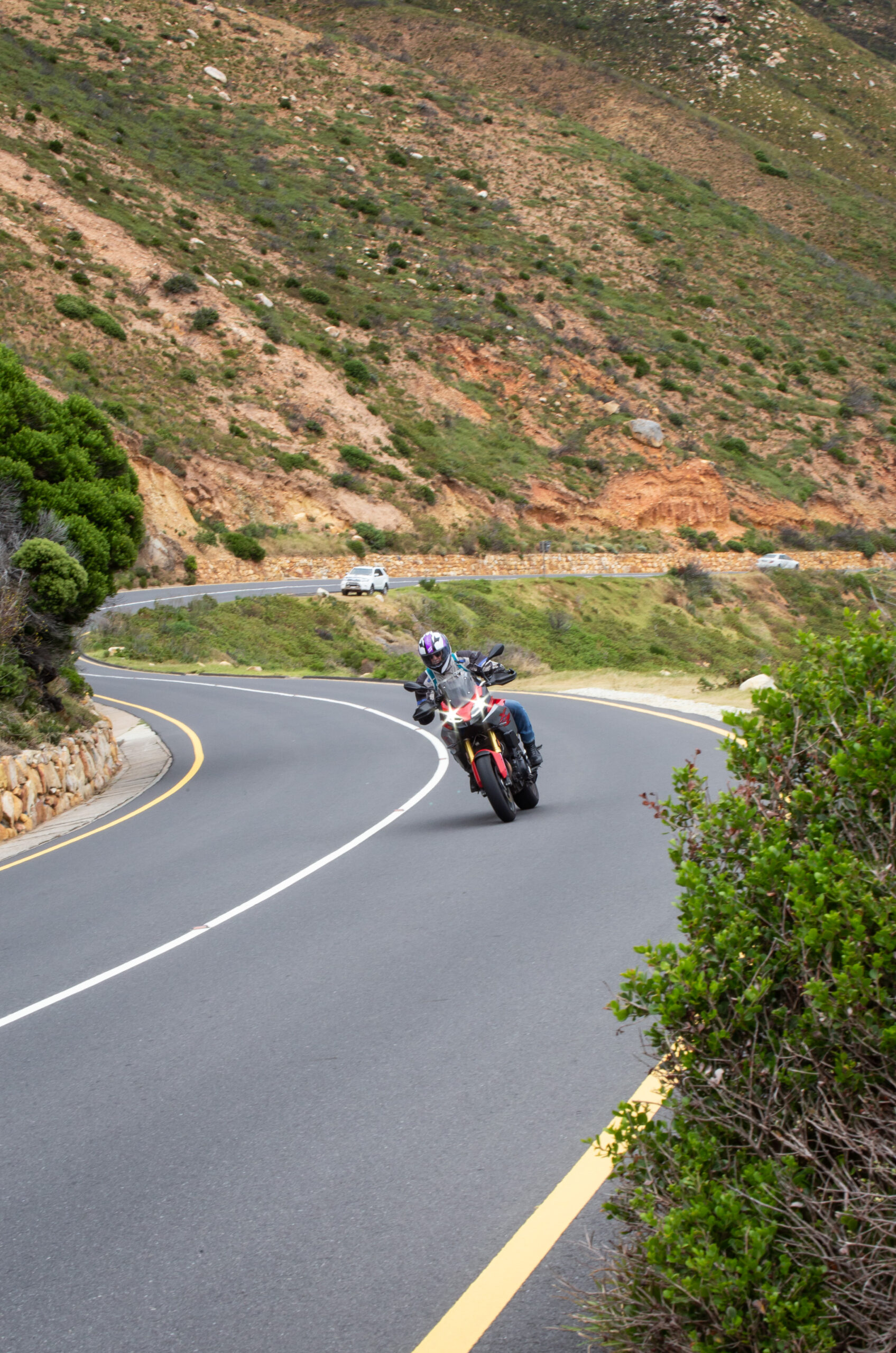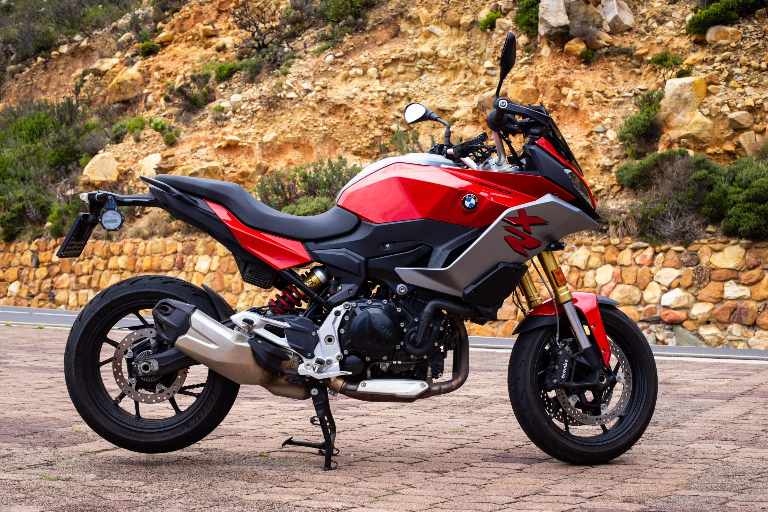 The F900 XR is a sport-tourer and fits into both roles rather well in my opinion and follows rather closely in the tracks of its bigger brother, the S1000 XR. The F900 XR is obviously down on power with its 895cc motor making 77 kW when compared to the S1000’s 999cc that makes 121 kW. Power to the rear wheel is a standard chain and sprocket drive. The two bikes almost weigh the same with F900 XR coming in some 4 kg lighter at 219 kg. But there is more than enough power and torque to comfortably cruise out to Rooi Els along one of the best roads in the Western Cape. Even two up, the F900 XR pulls well in each gear and the 92 N.m of torque available at around 6 500 r/min preclude constantly flipping through gears. The six-speed gearbox is nice and precise. I especially like the new EBC engine braking control. EBC smoothes out the engine braking effect, so even a heavy downshift is taken care of and you never feel like the back wheel will lock up. The F900 XR also has DBC Dynamic Brake Control, which goes hand-in-hand in with EBC, ABS and the MotoRad Brembo brakes. Combined, these systems give this motorcycle phenomenal stopping power.