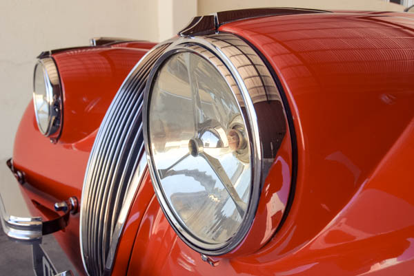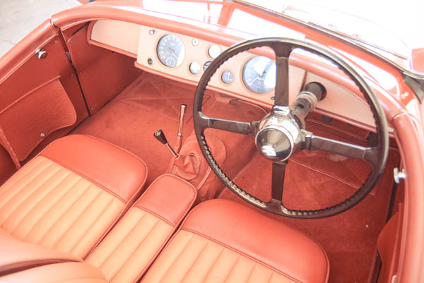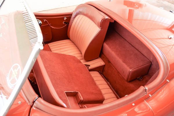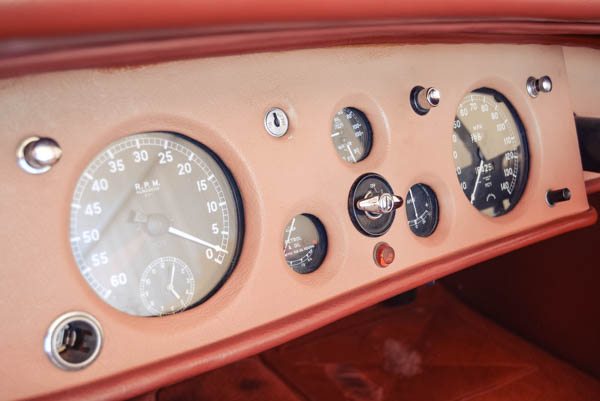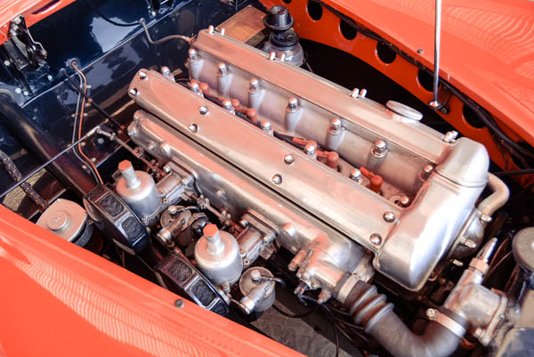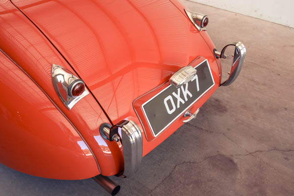 Built on a Jaguar Mk.V saloon chassis, the XK featured wishbone and torsion bar independent front suspension with semi-elliptic springs at the rear, Burman recirculating-ball steering directing 16-inch steel wheels, and 12-inch drum brakes all round, which apparently were prone to fade. The XK’s long, flowing lines – an early example of Lyons’ eye for style (remember the company’s motto Grace, Space and Pace?) – are enhanced on this car by the bright red paintwork, and up close it is surprising just how long and low the car is. The rear-wheel spats and lack of exterior door handles emphasize the smooth lines.