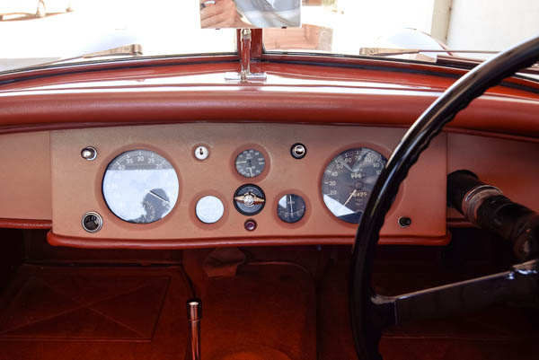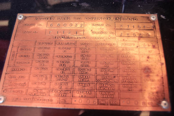 So with the XK120 we have a lot to be thankful for. Picking up from where the SS100 left off when it ceased production in 1940, the XK120 was manufactured in three body styles (drophead, fixed-head and roadster) between 1948 and 1954 and a total of 12 055 were built, of which the first 242 were bodied in aluminium over an ash frame. The FMM’s roadster – chassis no. 660032, body no. F1121 – is one of these rare early examples. The car’s engine – no. W1164-7 – is correspondingly one of the first of the in-line six-cylinder XK-series motors that was produced in five displacements during a 44-year life span. Initially with a displacement of 3 442 cm3, the iron block/alloy head engine featured dual overhead-cams, inclined valves with inverted bucket tappets, and hemispherical combustion chambers. With dual SU HS6 carburettors and an 8,0:1 compression ratio, the long-stroke (83×106 mm) motor produced 119 kW at 5 200 r/min and 265 N.m of torque at 2 500. UK’s The Motor magazine road-tested an XK120 roadster in November 1949 and with an undertray fitted and hood and sidescreens in place, it recorded a 0-60 mph (96 km/h) time of 10 seconds and a top speed of 124,6 mph (200,5 km/h). Fuel consumption was given as 19,8 mpg – 14,3 ℓ/100 km.