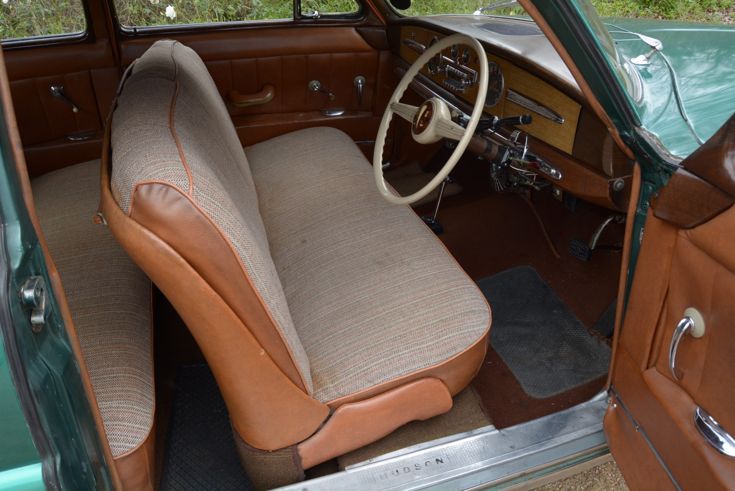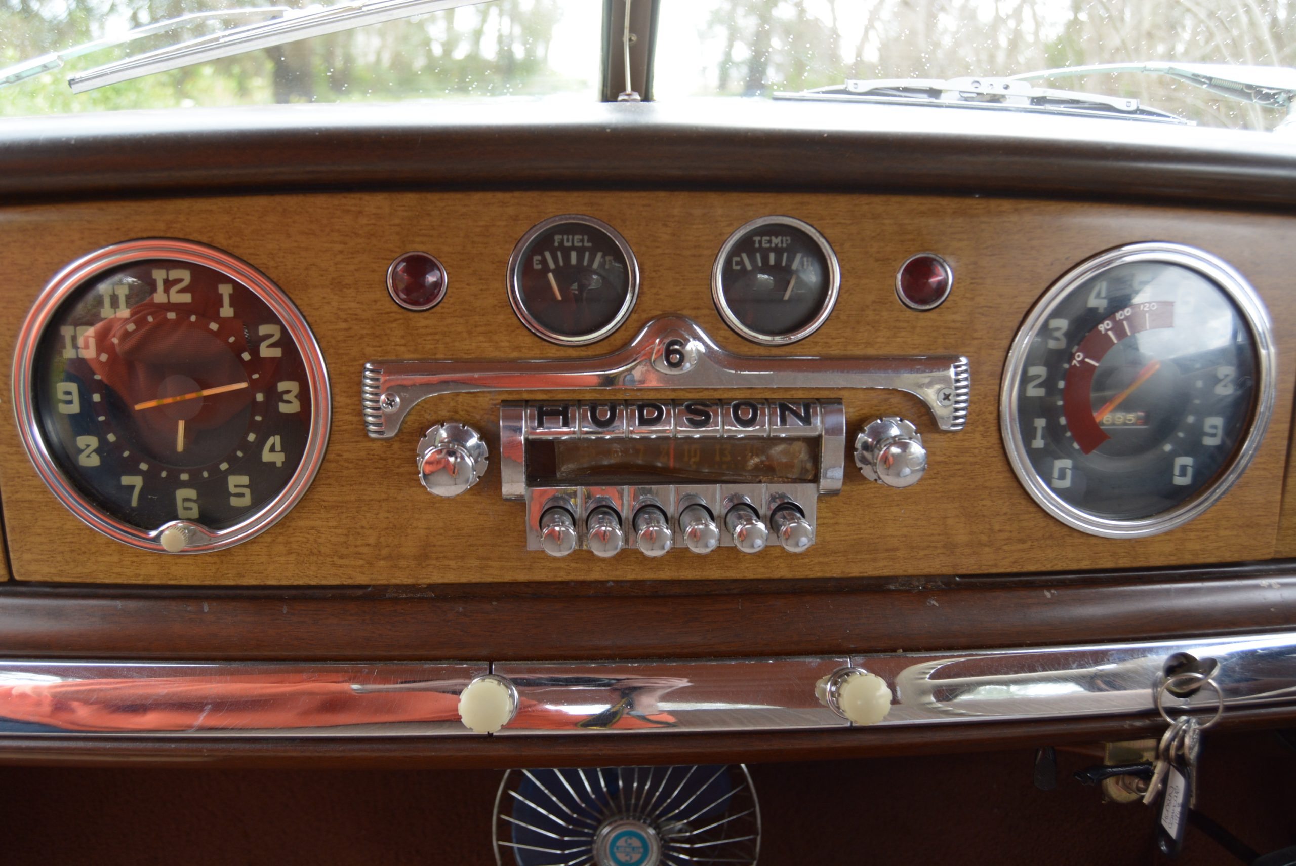 Inside, seats featured foam cushions and striped, Bedford Cord upholstery. Standard luxury features included a two-tone walnut-grained dashboard, instrument light dimmer, swivelling sun visors, electric clock, opening rear quarter-lights, and a 17-inch plastic steering wheel. Hudson offered a wide range of powertrain and convenience options on all models.