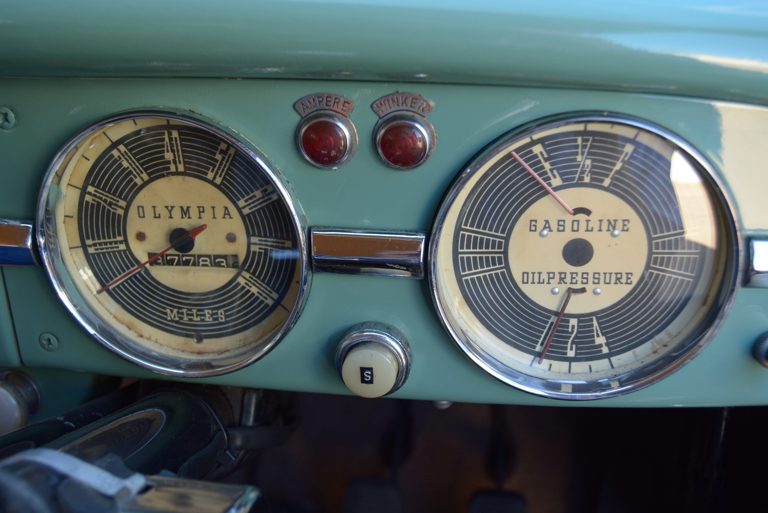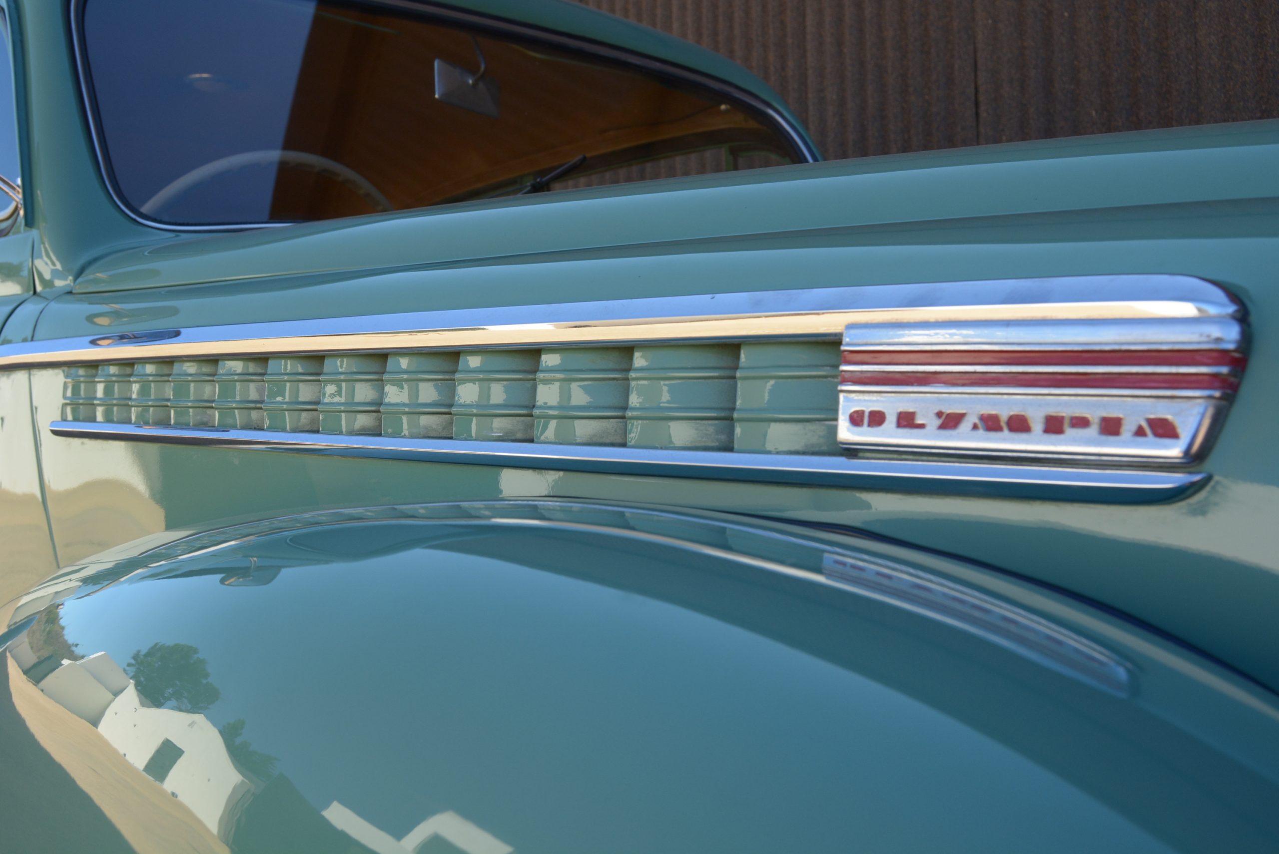 A hard shove on the middle pedal brought about reassuring stopping power. Tired dampers helped provide a slightly floaty ride, while the big, thin-rimmed three-spoke steering wheel required only modest muscular input at slow turning speeds. Otherwise, cruising along, the Olympia surprised with its quiet, stable gait, excellent view out and even a bit of bling with its chromed pointed bonnet mascot pointing the way ahead.