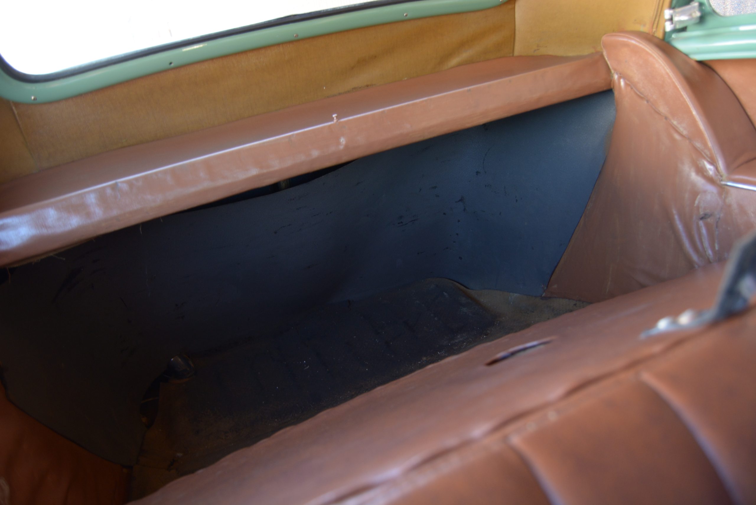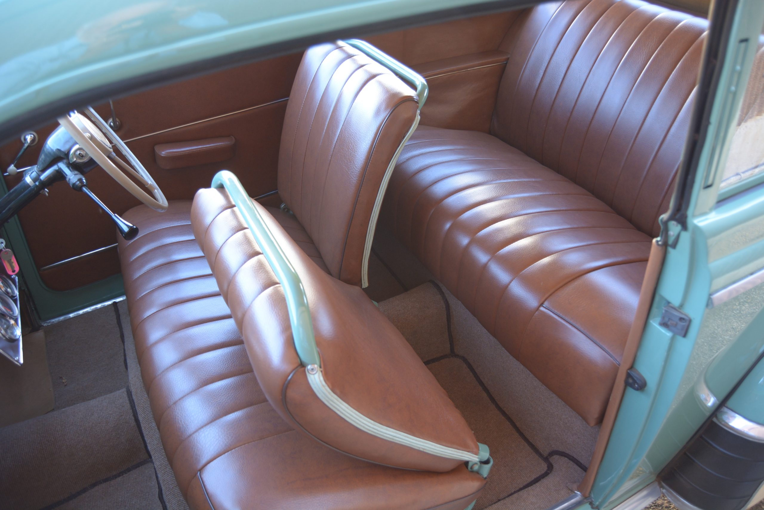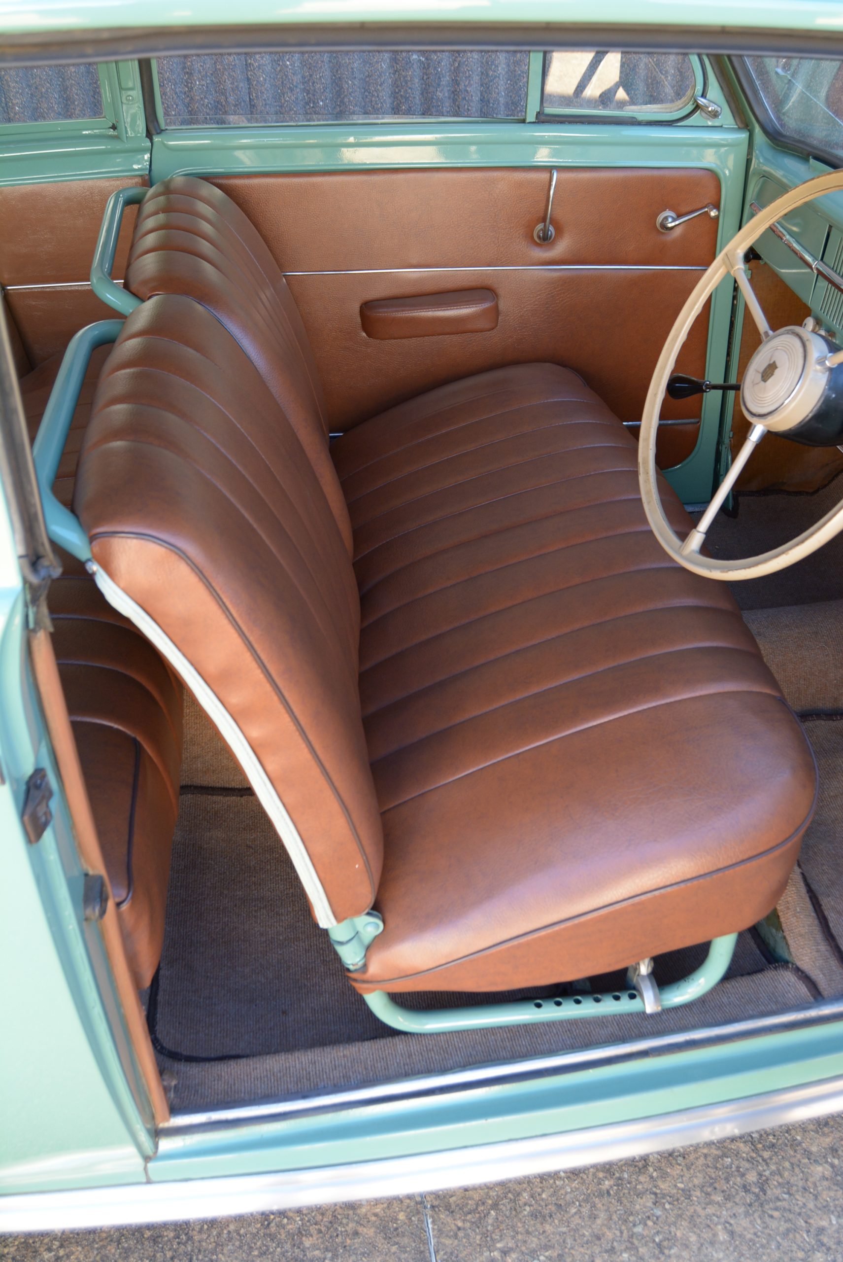 Inside it is no less appealing. The front seat has leather-upholstered cushions and squabs on an otherwise minimalist framework that offers adjustment from barely enough to practically nil. The split backrest allows entry to the rear, but the limited rearwards movement does provide some reasonable legroom for rear-seat passengers. The car’s only real downside is if you have to carry goods, in which case the rear seat backrest has to be pulled forward to access the boot as there is no exterior opening. For the driver, the painted metal dashboard houses two big dials for speed and fuel/oil pressure, trendy white knobs, warning lights for amps and ‘winkers’, and the ignition switch.