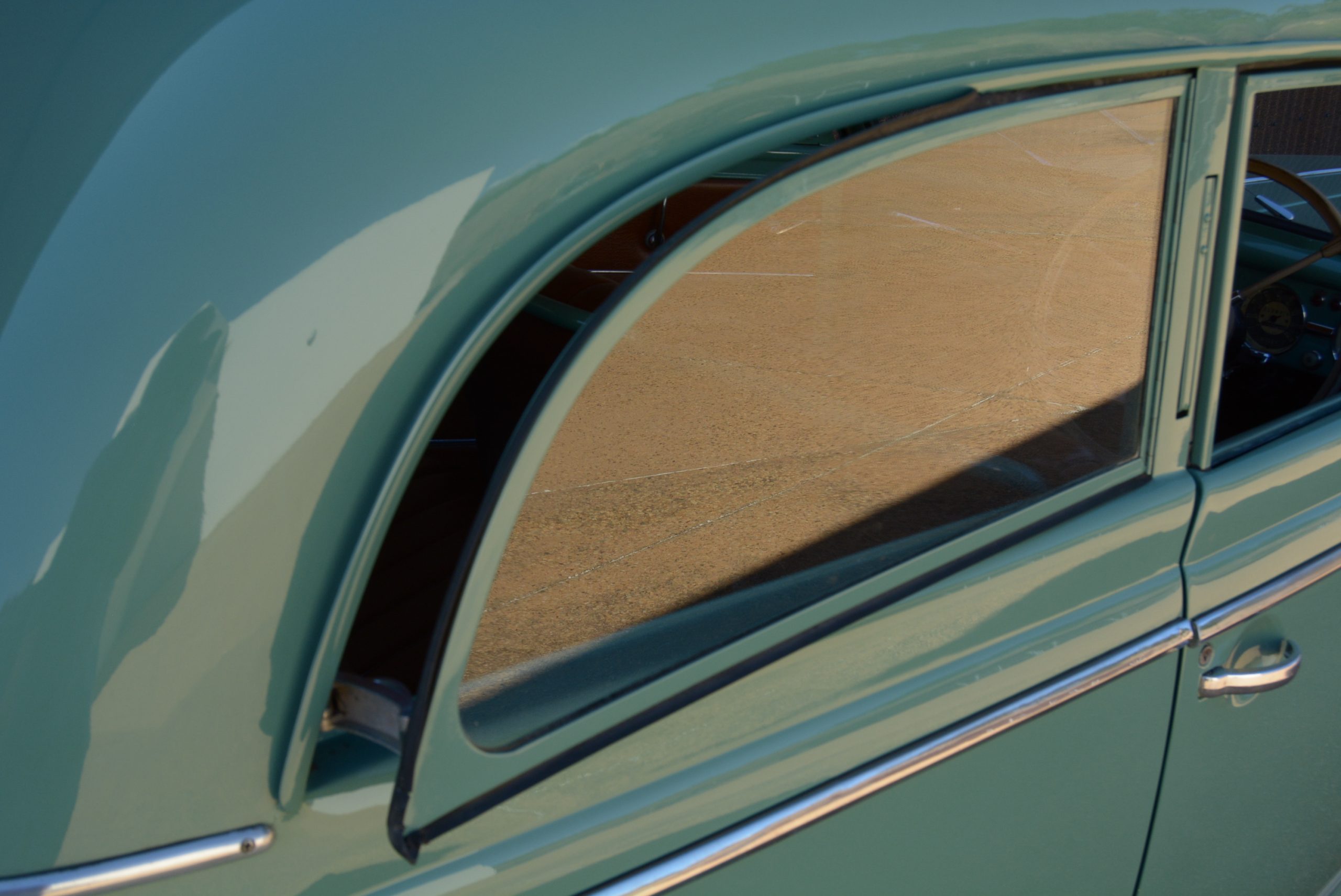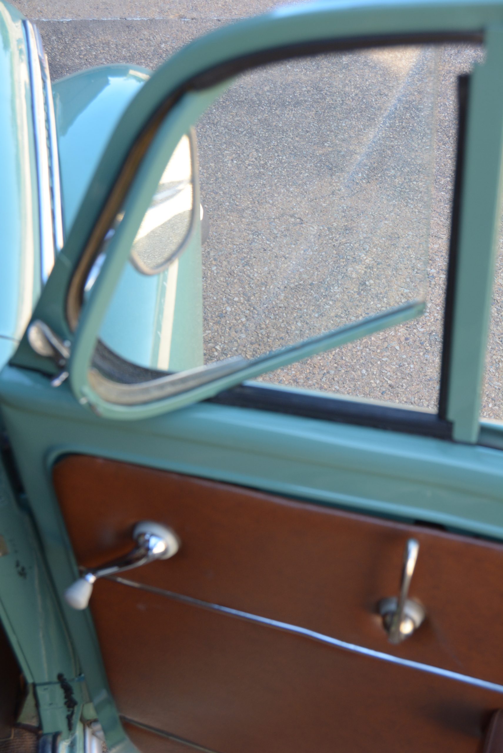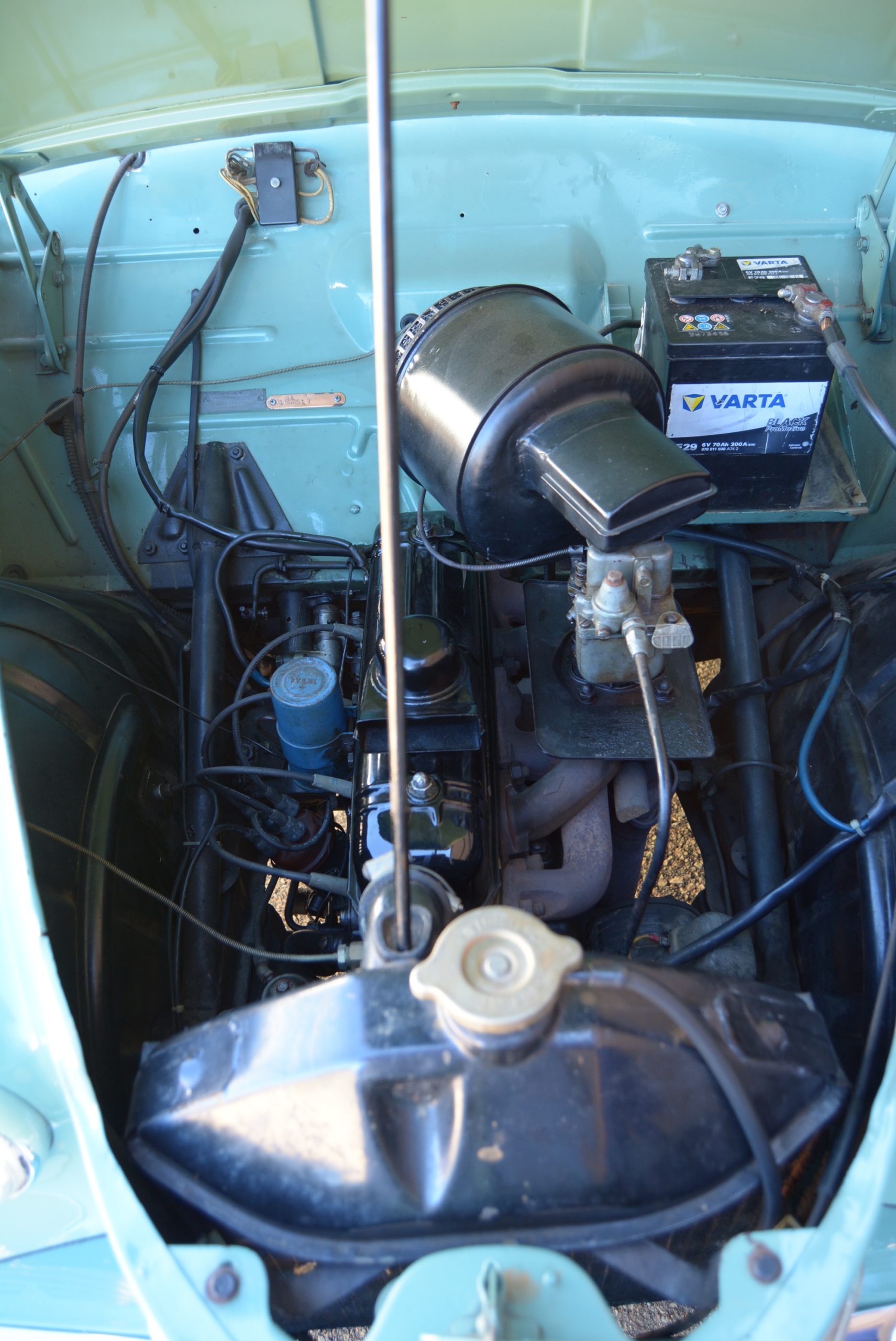 Ah, starting the car was a mystery at first until a button in the passenger side footwell (similar to, but larger than, the one on the driver’s side for dipping the headlamps), was depressed to bring the engine into life. Engage first with the column-shifter, release the stout handbrake under the dash to the right, and away we go. The engine is surprisingly willing given its modest power output, while the gearbox  proves to be an absolute delight, with second an elastic ‘do anything’ ratio from walking pace up to near cruising speed. The top two ratios boast synchromesh and the shifter moves with surprising precision, helped by a comfortable clutch action.
