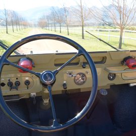 Getting in requires unhooking a steel rope and stepping up and over the high sill. Seats are rudimentary buckets but provide a satisfactory driving position, save for the floor-hinged pedals being offset to the right – the Munga’s wheelbase is short and the broad wheelarches intrude as a result. The spindly spokes of the large steering wheel are matched by the bent rod gearlever, while the far more substantial handbrake lies between the seats. What does appear out of place is the headlamp dip switch protruding from the floor under the driver’s feet.
