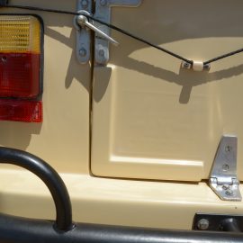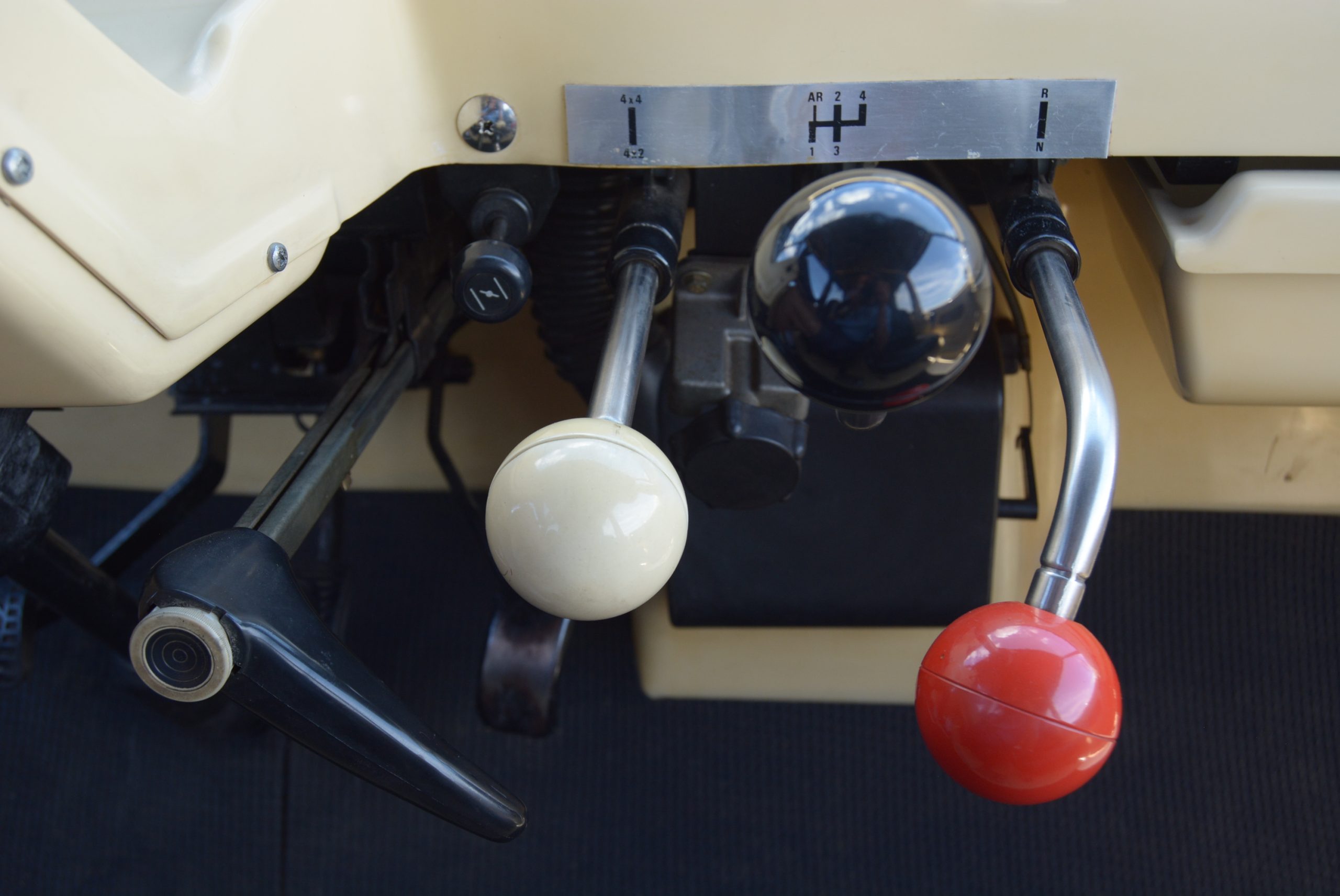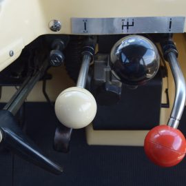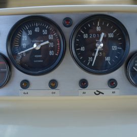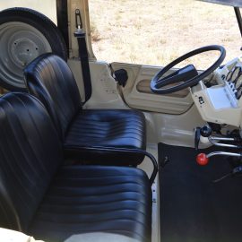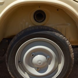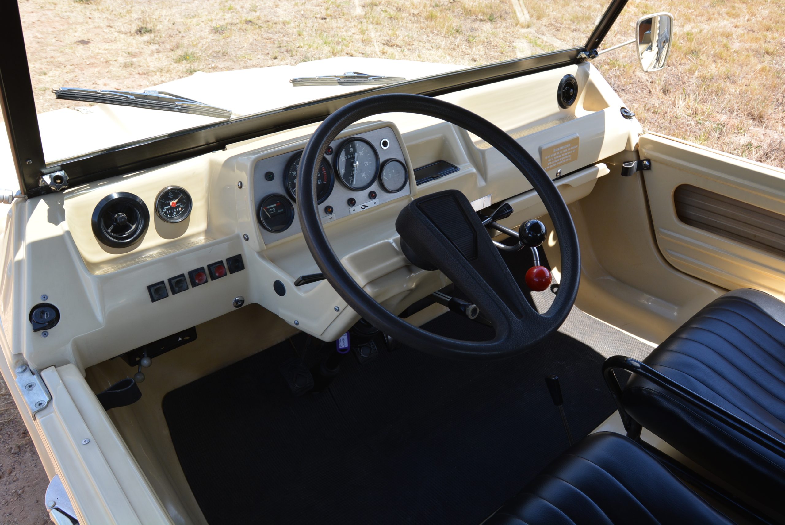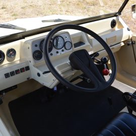 FMM’s Hoggar Beige example is in superb condition for a 47-year-old off-roader. The elaborately-hinged shallow doors give access to a spacious cockpit housing a pair of bucket seats. Like all Méharis, it is left-hand drive and the trademark Citroën single-spoke steering wheel is noticeably near horizontal. The pedals are offset to the centre of the vehicle – the brake and accelerator are virtually in the centre to the right of the steering column – so the driving position is far from ideal, but such is the character of the car that it does not become an issue.