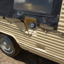 The body was mounted on a tubular frame underpinned by the long-travel, all-independent suspension and running gear of the 2CV6. The Deux Chevaux’s engine was also utilised, the 602cc flat-twin delivering 22 kW at 5 750 r/min and 39 N.m of torque at 3 500. Transmission was the customary four-speed manual with Citroën’s oddball pull-push gear shift protruding straight out of the facia – first opposite reverse, second and third in a single plane, and fourth out on a limb. To the unfamiliar, it takes a while to get the hang of it, but eventually becomes less of a challenge.