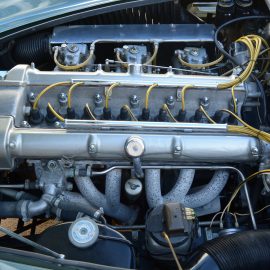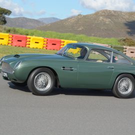 The DB4 had been fitted with a new 3670cc in-line, six-cylinder, twin overhead-cam engine designed by Aston’s renowned Polish engineer Tadeusz ‘Tadek’ Marek. The all-aluminium seven-main-bearing motor had equal bore and stroke dimensions (92×92 mm) and was fed by twin SU carburettors. It pumped out 179 kW at 5 500 r/min and 325 N.m of torque at 4 250. Mated with a David Brown four-speed gearbox, top speed was 225 km/h and 0-60 mph (96 km/h) took nine seconds while 0-100 mph (161 km/h) took 21 seconds. Thanks to servo-assisted Dunlop disc brakes all round, the DB4 could do 0-100-0 mph (0-161-0 km/h) in less than 30 seconds. Overdrive became a Series 2 option in 1960, and a Vantage version with an extra 19 kW became available with the Series 4.