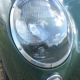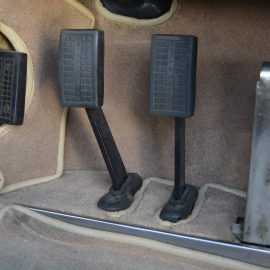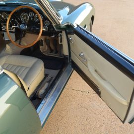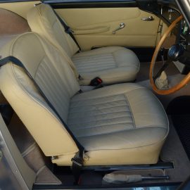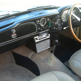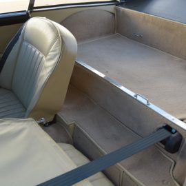 Painted in what can be called British Racing Green (the true hue of the nation’s international racing colour is a story in itself…), the car oozes classic Aston Martin elegance, the cream leather upholstery and matching cut-pile carpeting complementing the exterior. The alloy-spoke/wood-rim steering wheel and fly-off handbrake, situated to the right of the driver’s seat, are period details that add to the overall effect. Pedals are all mounted on the floor, and there is a small left-foot rest. The painted dashboard carries a full complement of instruments and controls as well as a period radio. Oddly, the ventilation controls, one for each side, are mounted beneath the dash on the inside of the side panels. The sun visors are a deep blue plastic.