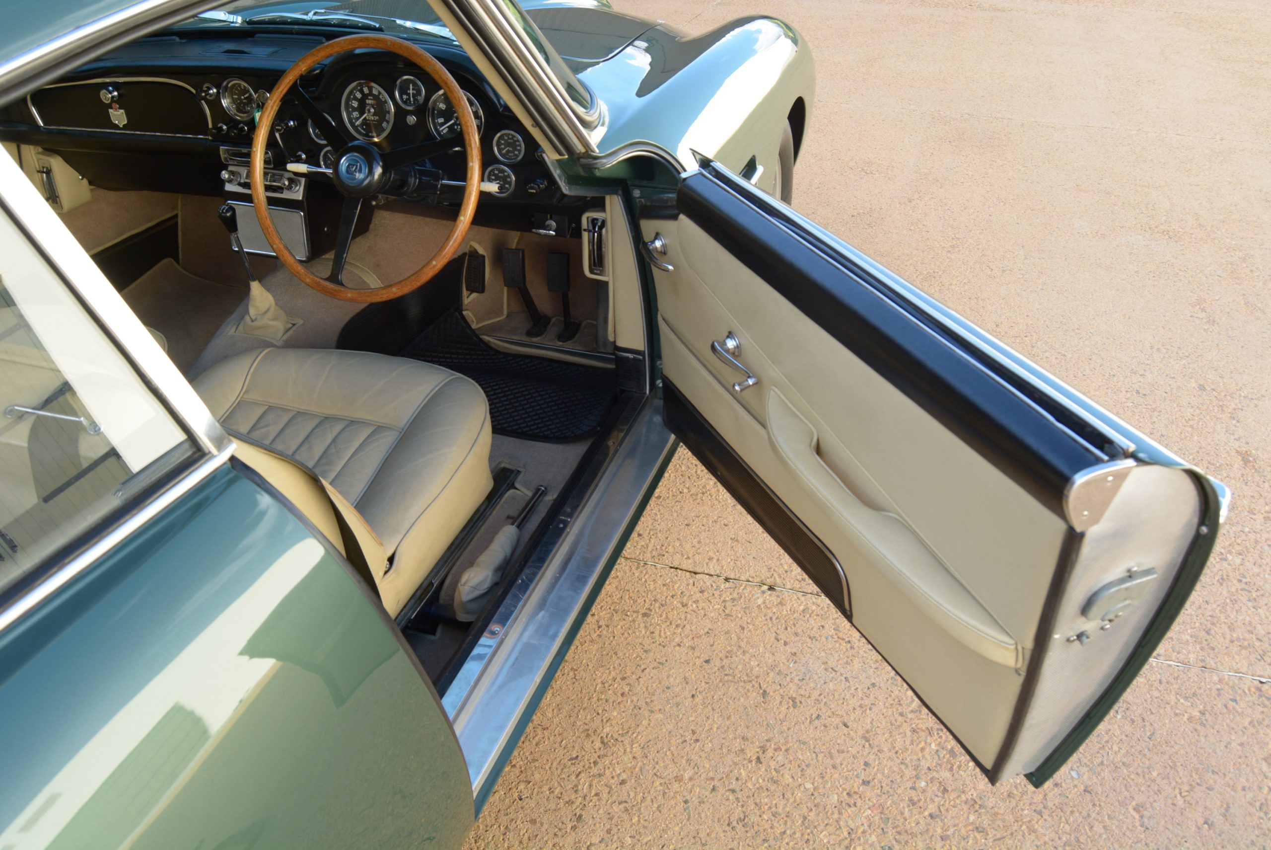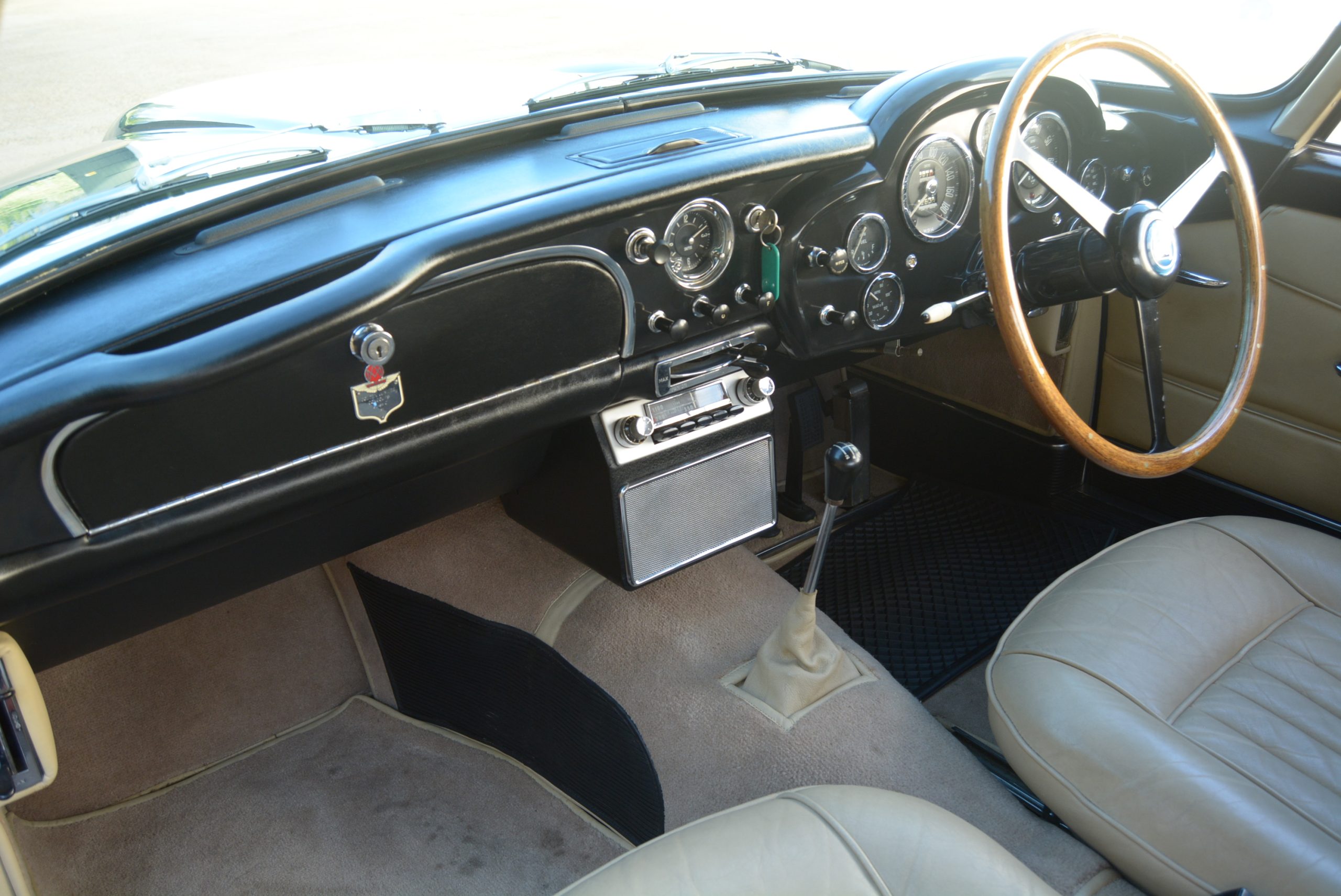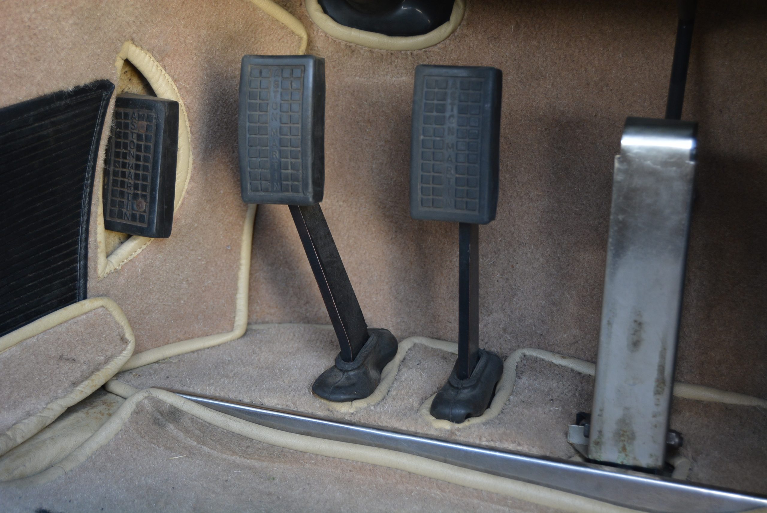 Painted in what can be called British Racing Green (the true hue of the nation’s international racing colour is a story in itself…), the car oozes classic Aston Martin elegance, the cream leather upholstery and matching cut-pile carpeting complementing the exterior. The alloy-spoke/wood-rim steering wheel and fly-off handbrake, situated to the right of the driver’s seat, are period details that add to the overall effect. Pedals are all mounted on the floor, and there is a small left-foot rest. The painted dashboard carries a full complement of instruments and controls as well as a period radio. Oddly, the ventilation controls, one for each side, are mounted beneath the dash on the inside of the side panels. The sun visors are a deep blue plastic.