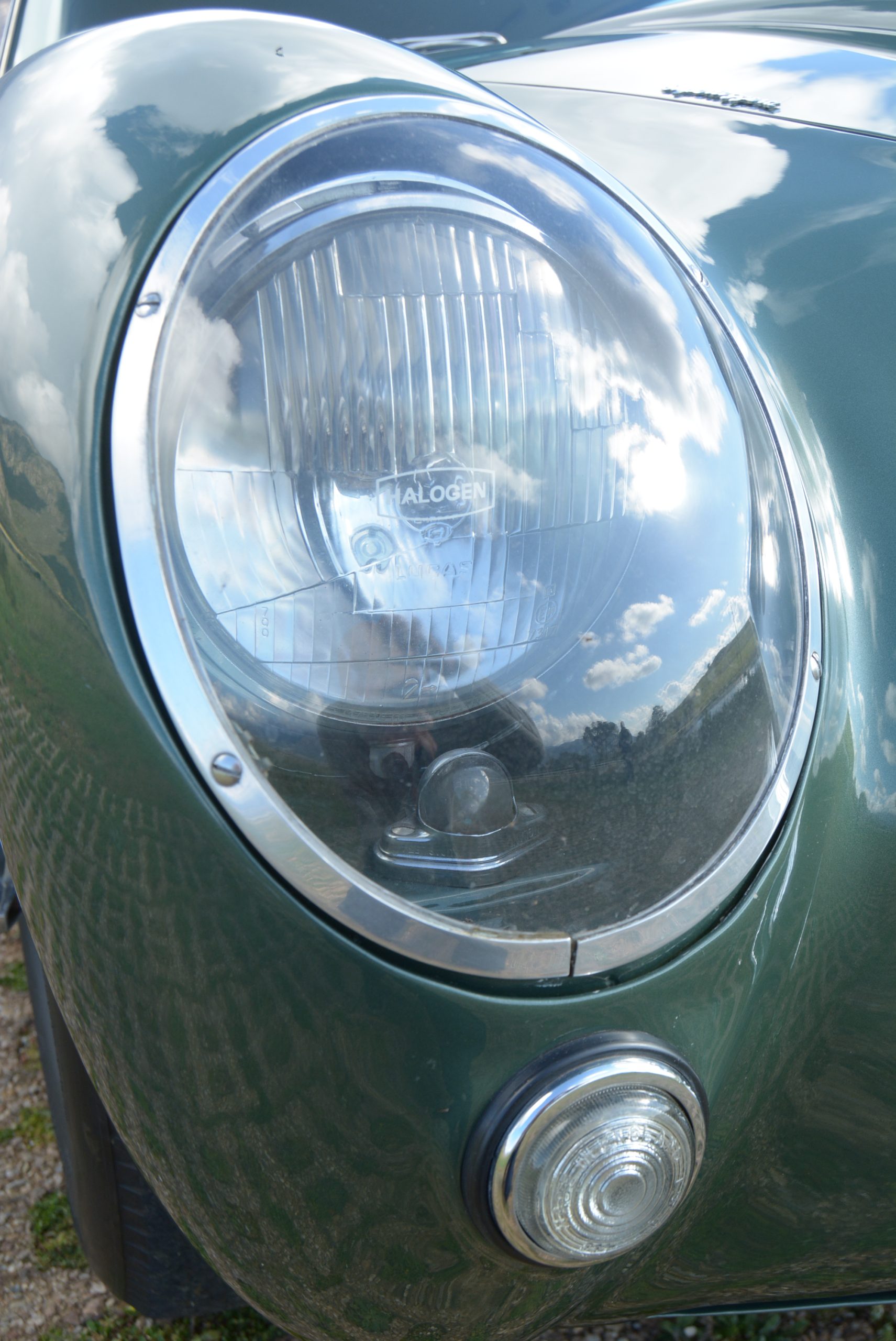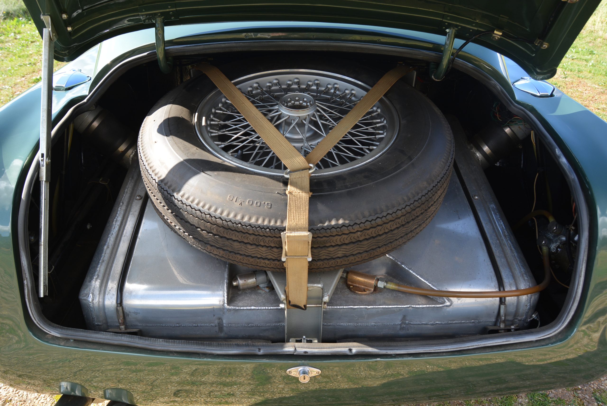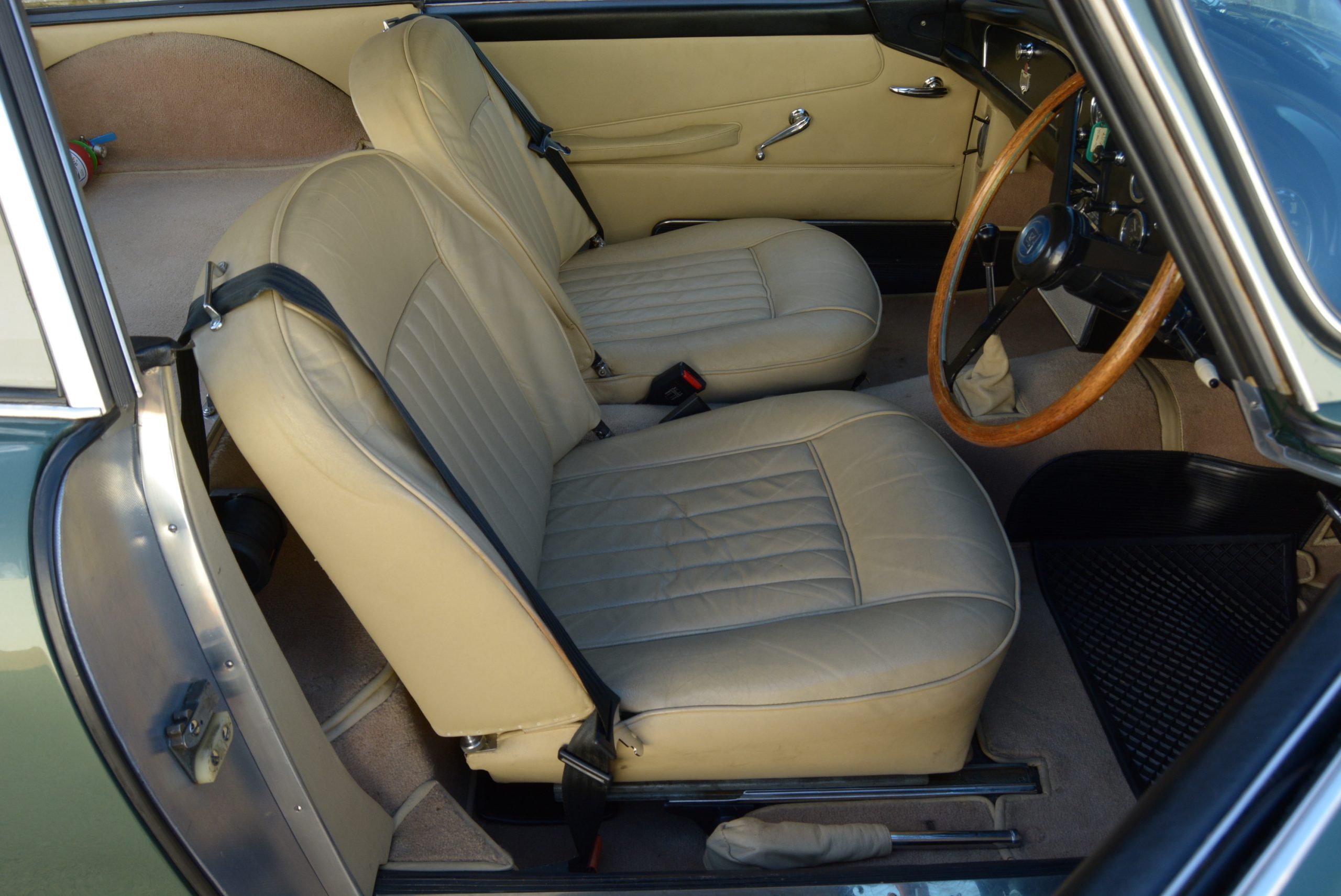 Painted in what can be called British Racing Green (the true hue of the nation’s international racing colour is a story in itself…), the car oozes classic Aston Martin elegance, the cream leather upholstery and matching cut-pile carpeting complementing the exterior. The alloy-spoke/wood-rim steering wheel and fly-off handbrake, situated to the right of the driver’s seat, are period details that add to the overall effect. Pedals are all mounted on the floor, and there is a small left-foot rest. The painted dashboard carries a full complement of instruments and controls as well as a period radio. Oddly, the ventilation controls, one for each side, are mounted beneath the dash on the inside of the side panels. The sun visors are a deep blue plastic.
