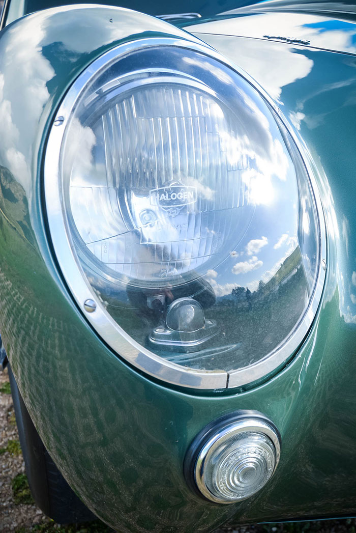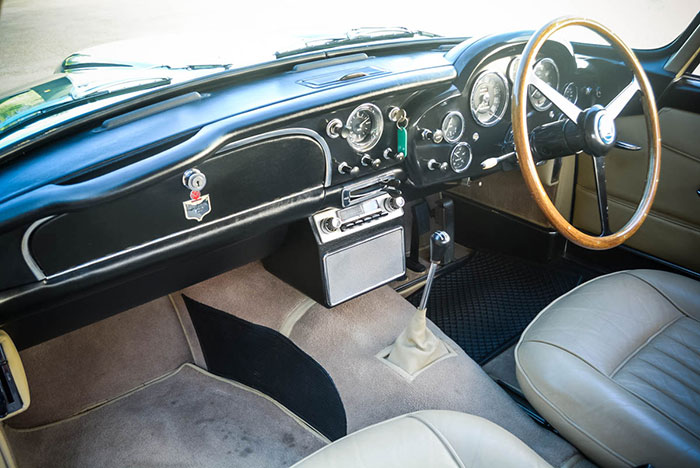 Painted in British Racing Green, the car oozes classic Aston Martin elegance, the cream leather upholstery and matching cut-pile carpeting complementing the exterior. The alloy-spoke/wood-rim steering wheel and fly-off handbrake, situated to the right of the driver’s seat, are period details that add to the overall effect. Pedals are all mounted on the floor, and there is a small left-foot rest. The painted dashboard carries a full complement of instruments and controls as well as a period radio. Oddly, the ventilation controls, one for each side, are mounted beneath the dash on the inside of the side panels. The sun visors are a deep blue semi-transparent plastic.