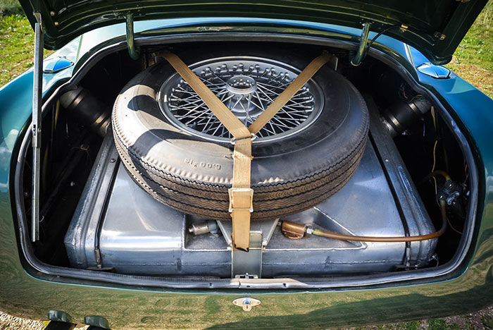 The DB4 was a sales success but in keeping with Aston’s tradition of developing a racing version of its production cars, a high-performance model was called for and the GT design project (designated DP199) got underway. Reducing the car’s weight was a major consideration, so thinner aluminium was specified for the bodywork and the 2+2 rear seat was ditched in favour of a carpeted luggage area. Wyer also wanted a more ‘edgier’ handling car, so the wheelbase was shortened by five inches (127 mm). In all, a weight saving of 90 kg was achieved. Borrani 16-inch wire wheels with knock-off spinners were used and the Salisbury final drive boasted a Salisbury Powr-Lok limited-slip differential. The boot was filled with a 136-litre fuel tank mounted under the spare wheel. The revised styling featured Perspex cowled headlights to reduce drag.