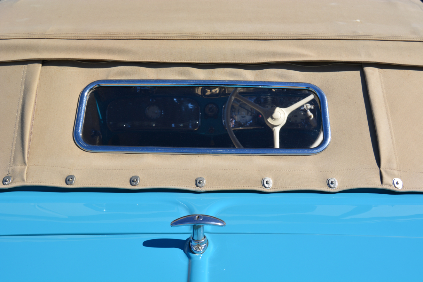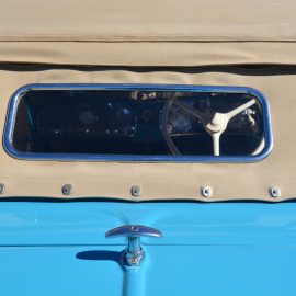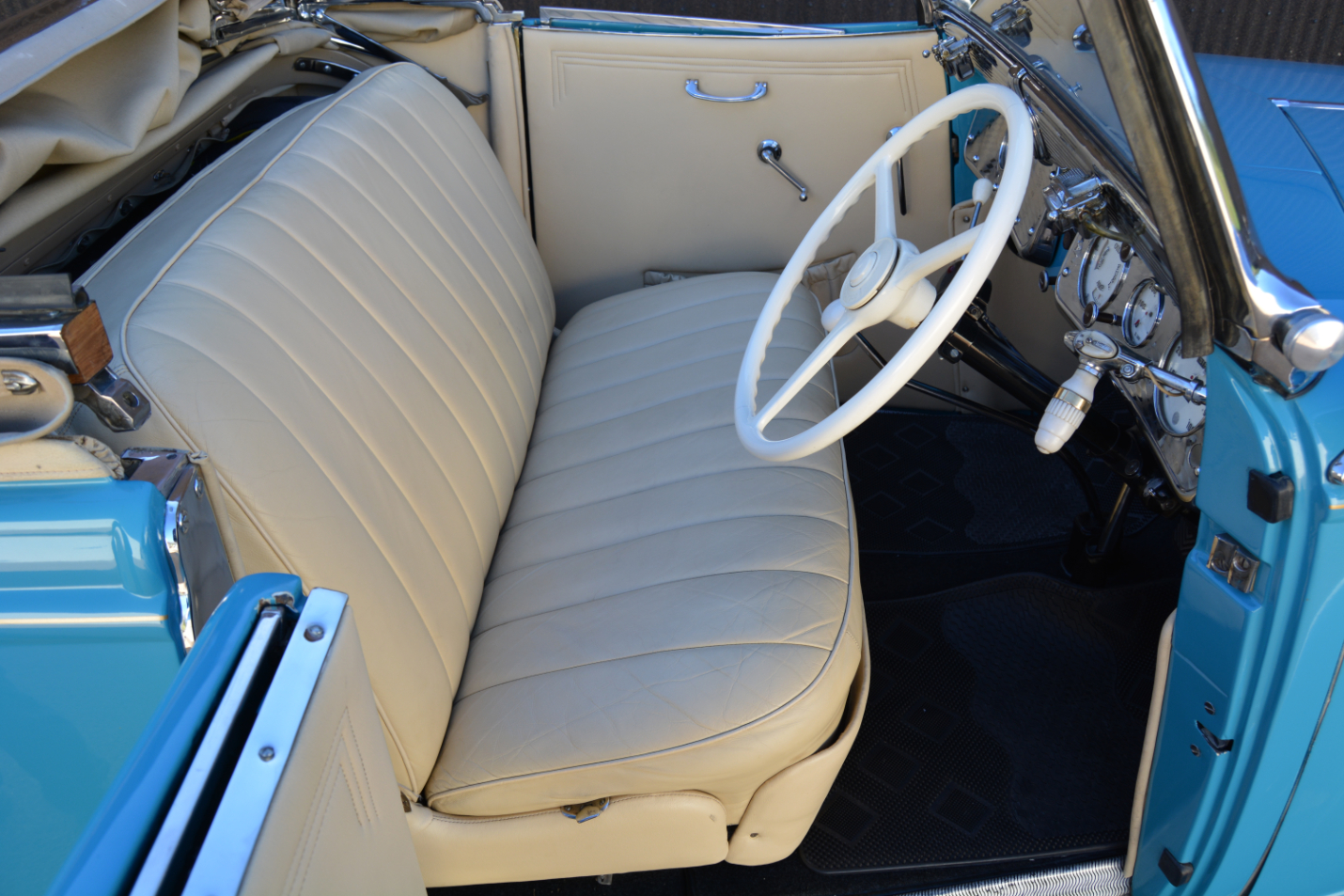 Hood erect – the rear window can be taken out – climbing aboard through the rear-hinged door and the interior has a comfortable, airy and lavishly equipped interior. Bright metal trim, elegantly styled instrumentation, ivory coloured steering wheel and knobs and taut, pleated leather upholstery and door trim ooze style and quality. But this is a car to be seen in, particularly in its striking sky blue paintwork, so after undoing a rather complex mechanism the substantial soft-top can be lowered and the thrill of al fresco motoring enjoyed.