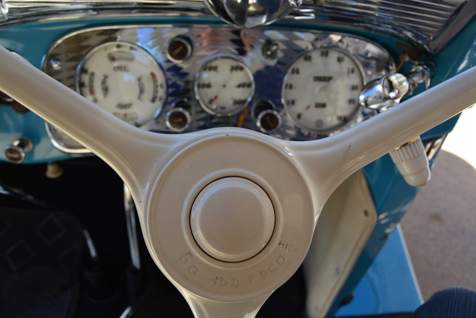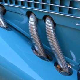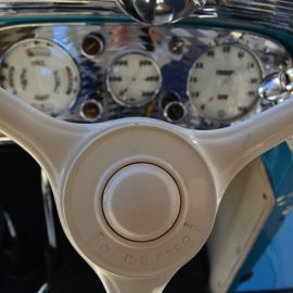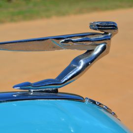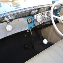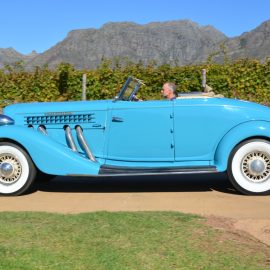One of Auburn’s strong points was its use of the Lycoming GG straight-eight engine. The block was cast iron and the side-valve flat-head made from aluminium. A five-bearing crank and a bore/stroke of 77,78 x 120,6 mm gave a swept volume of 4 587cc. From 1935, the single Stromberg downdraft carburettor was force fed by a Schwitzer-Cummins centrifugal supercharger (that spun to 24 000 r/min) helping to deliver a peak power output of 150 hp (112 kW) at 4 000 r/min. A three-speed manual gearbox took drive to a Columbia two-speed rear axle, the ratios (a ‘fast’ 4,5:1 and a ‘cruising’ 3,1:1) selected by a steering-mounted control, effectively creating a six-speed transmission. Top speed was the magical 100 mph (161 km/h), a fact promoted to good effect in the car’s advertising material. A Straight Eight Speedster driven by David ‘Ab’ Jenkins at Utah averaged 100 mph for 12 hours to establish a US Stock Car record.