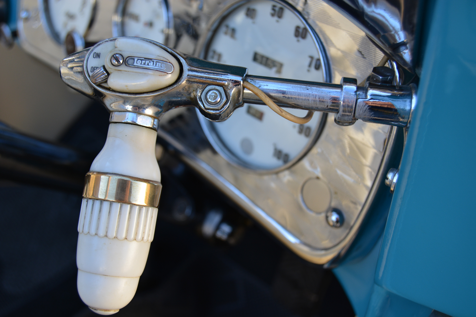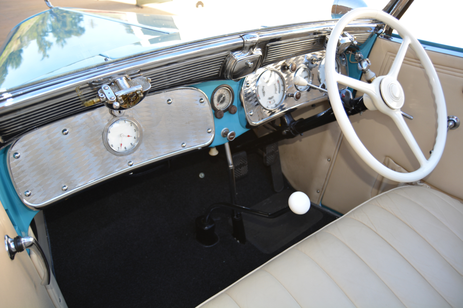 The result is a motor that delivers a deep-throat rumble from its exhaust system that features four flexible stainless steel pipes protruding from the left side of the side-louvred bonnet, dropping through the mudguard and running underneath the running board before merging into a single tailpipe. The word SUPERCHARGED in big script above the louvres adds significantly to the appearance. The set-up looks dramatic and the exhaust’s basso profundo tone characterises the car’s screen-siren looks and Oscar-nominated performance. Why, it even has its own spotlight…