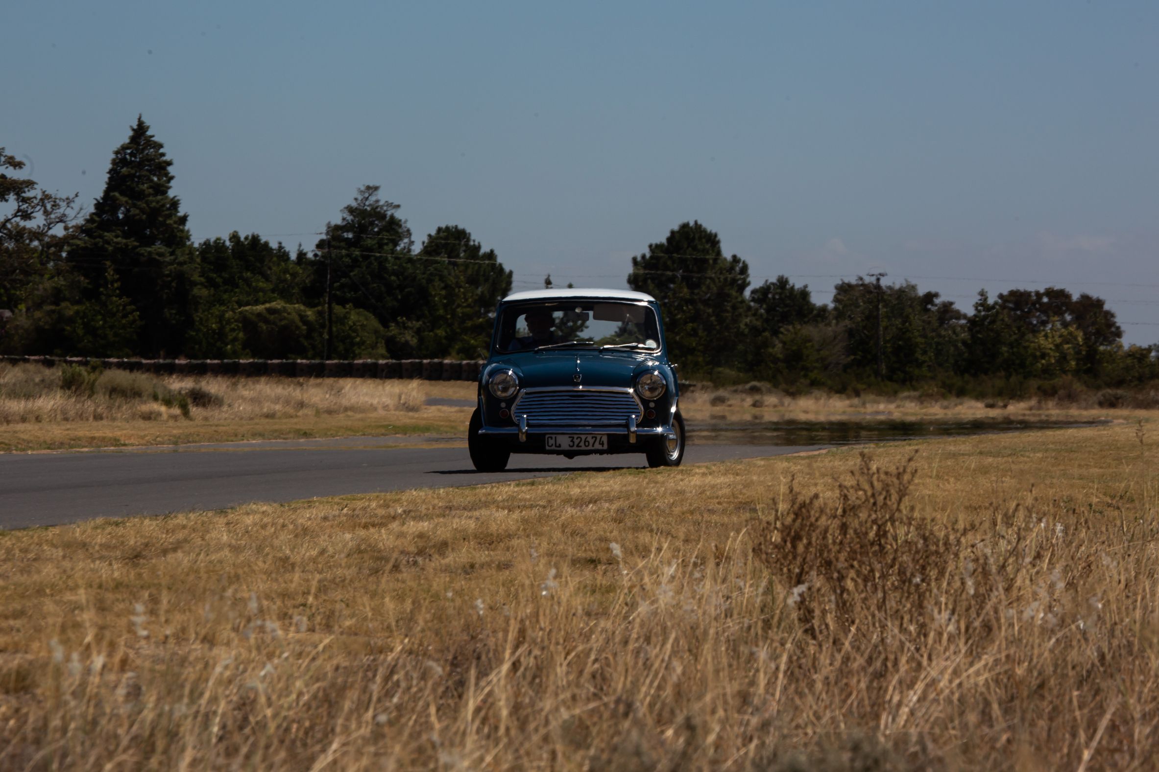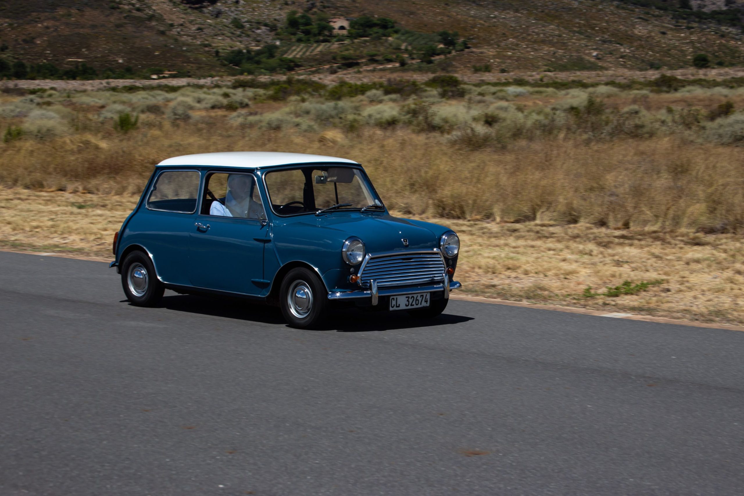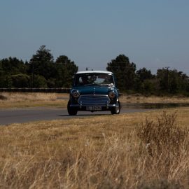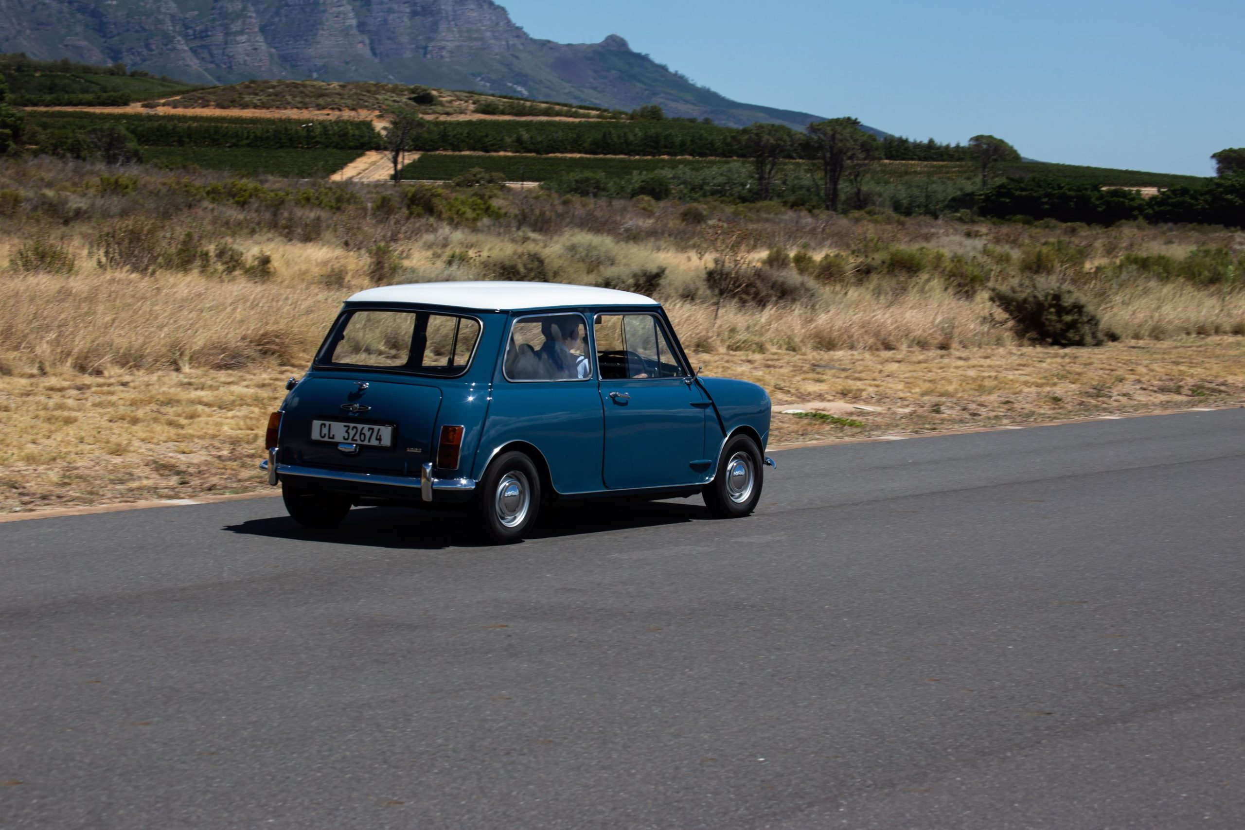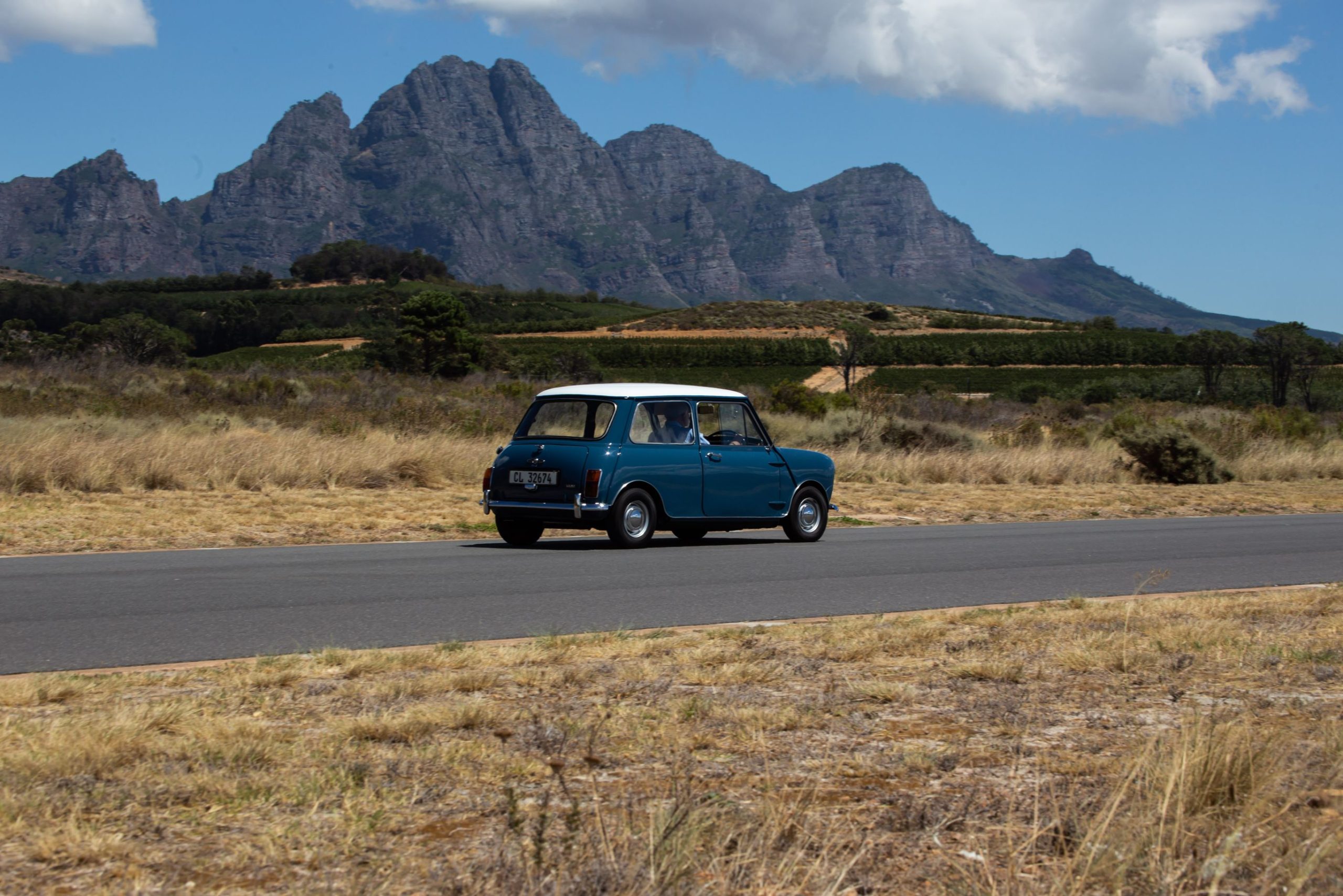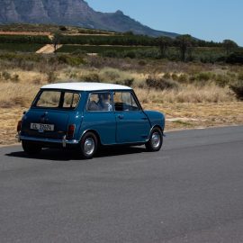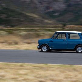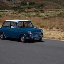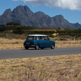 Given the freedom of the L’Ormarins PlaasPad, the car was a bundle of fun to drive. The pedals are well placed and the simple, plastic, two-spoke steering wheel is easy to twirl. An aftermarket rev counter sits in the full-width parcel tray, but otherwise the interior is stock standard. While not super fast along the straight sections of the track, the experience of buzzing along with an uninterrupted view of the Franschhoek Valley playing out to the soundtrack of the lively engine’s exhaust was smile-inducing all the way. Through the twistier sections there was hardly any need to brake or lift off, the Mini’s legendary kart-like handling rising to the fore. The old hard tyres squealed a bit but I took it as squeals of excitement rather than protest. Visions sprang to mind of Minis racing in their heyday against much bigger and more powerful machinery, losing out down the straights but doing a David versus Goliath act through the corners. Magic memories…
