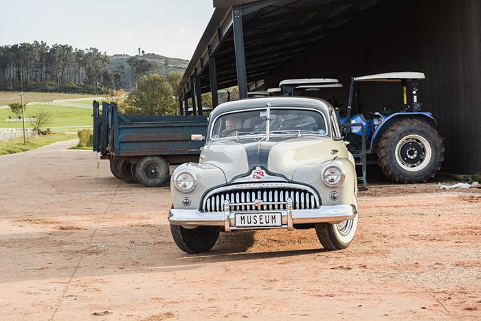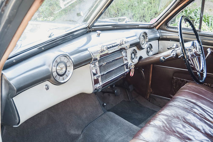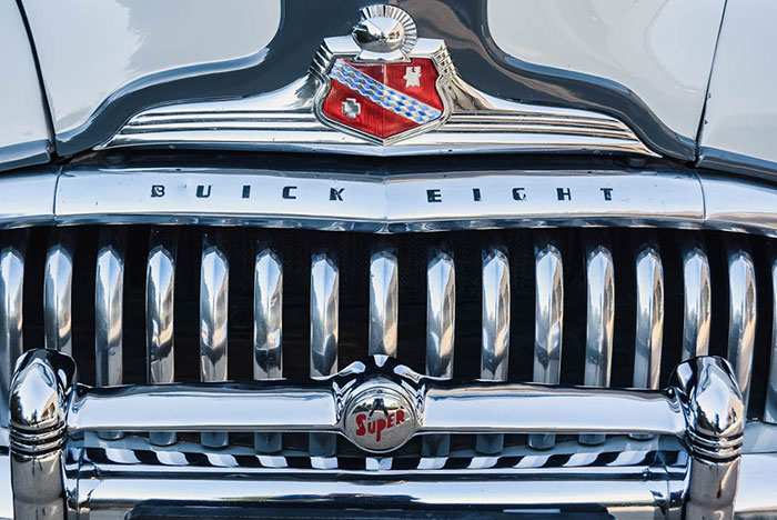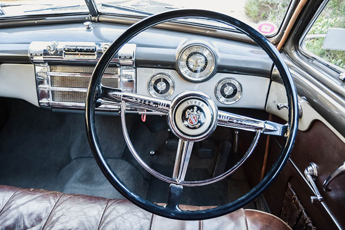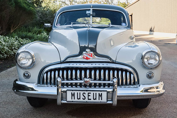 Open the door and slide onto the full-width bench seat and the spirit of excess continues with a 70-year-old dashboard layout bling-full of bright controls and instruments, typified by the radio’s five push buttons, each carrying a letter to spell out the name BUICK. The aerial is pivoted immediately above the centre divide of the split front windscreen and can be either folded down and clipped to the divide or raised vertically for optimum reception. But there are more practical features too, such as automatic courtesy lights at the base corners of the seat illuminating the footwells.