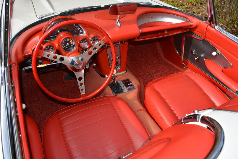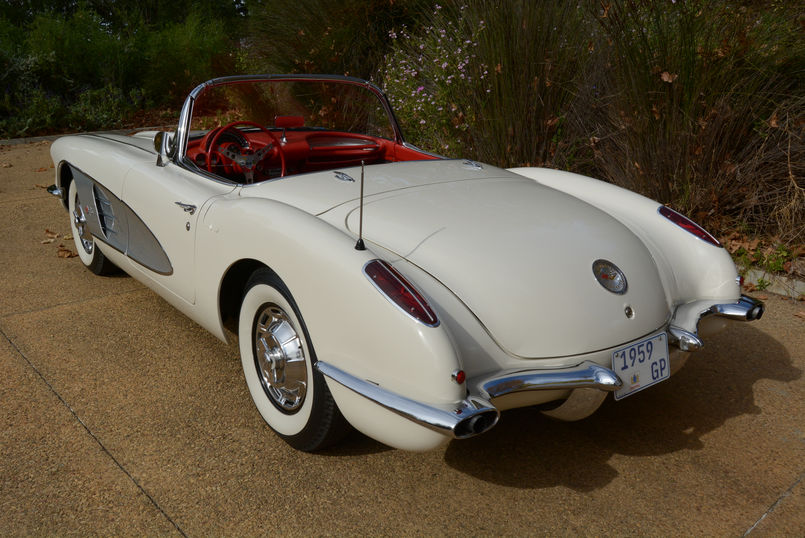 Quick to respond to public opinion, the 1959 Corvette was less flashy and more comfortable. A T-handle lockout was added to the gear lever of the four-speed ’box to prevent accidental engagement of reverse. Other improvements included concave instrument lenses to prevent reflections and the addition of a parcel tray under the passenger grab handle. Most significantly, trailing radius rods were incorporated into the rear suspension to help prevent axle wind-up caused by the more powerful engines. Upgraded brakes and power windows were among the options. “New sleekness, elegance and roadability for America’s only sports car” was Chevrolet’s new claim.