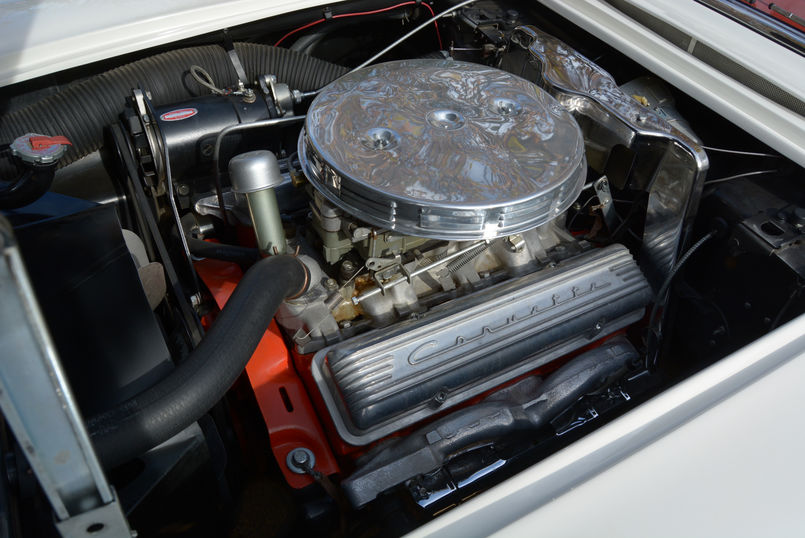 But then two important happenings took place. Chevrolet chief engineer Ed Cole introduced the small-block V8, which would provide the answer to the Corvette’s dull performance, just as fellow engineer Zora Arkus-Duntov made some simple changes to the car’s underpinnings to improve its handling. The transformation was timeous: now with a 265 ci (4 342 cm3) V8 giving 195 hp (145 kW) under the bonnet, the Corvette had some go to match the show – and was better able to compete with Ford’s newly-introduced Thunderbird V8, which had stimulated the two-seater market. A spin-off effect of the V8 was that it was lighter than the six, so the car’s front-rear weight distribution improved to 52:48. And electrics were changed from six- to 12-volt.