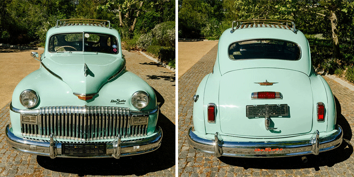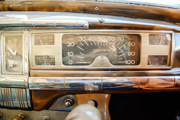 Under the l-o-n-g bonnet lies a fairly unstressed cast iron 236,7 ci (3 878 cm3) in-line six-cylinder engine running in four main bearings. The side-valve motor had lifters and was fuelled by a Ball and Ball carburettor with a 6,6:1 compression ratio. An Oilite fuel tank filter was a standard item. Peak power was 109 bhp (81,5 kW) at 3 600 r/min and maximum torque was 260 N.m at 1 200. A three-speed manual gearbox was standard on the Deluxe with a two-speed Fluid Drive ‘Tip-Toe shift’ standard on Custom models – optional on Deluxe. Although called Fluid Drive, the DeSoto transmission was in reality a two-speed manual transmission with a conventional clutch mounted behind the same fluid coupling unit that was installed in straight Fluid Drive cars. Theoretical top speed was 119 km/h and 12-inch (305 mm). Safe Guard hydraulic drum brakes were fitted all round.  White-wall 6.50×16 tyres (later 7.00×15) were standard on Custom models.
