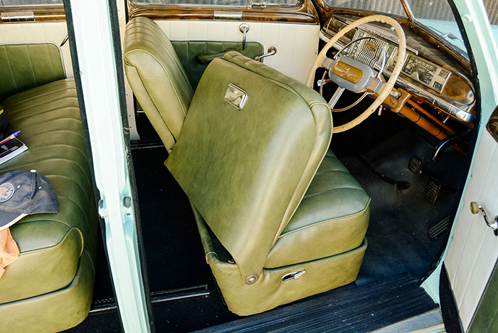 The interior was quite classy. The cushions of the sumptuous seats had foam rubber pads, and the floor had tailored carpets. Burl and grain garnished dashboard and door cappings, leather upholstery and two-tone door mouldings with chrome handles and a full complement of courtesy lights and grab handles added a touch of class to the fittings. A push-button radio was also included. By contrast with the split windscreen, the front door windows feature frameless quarter-lights and the rear door glass is a single pane. Opening rear side windows helped ventilation.