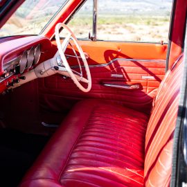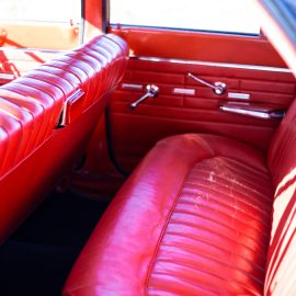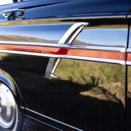FMM’s 1964 500 four-door sedan has the V8 motor and a column shift three-speed manual gearbox. Painted black with a red interior, somehow its three-box shape has an air of mystique about it, a promise of delivering more than it shows. For sure, the exterior trim adds a touch of bling, but its boxy, Sixties America persona hides what’s underneath…