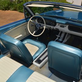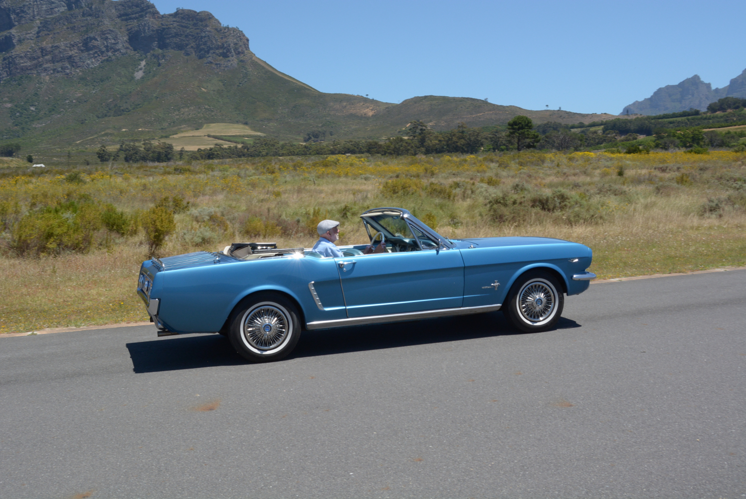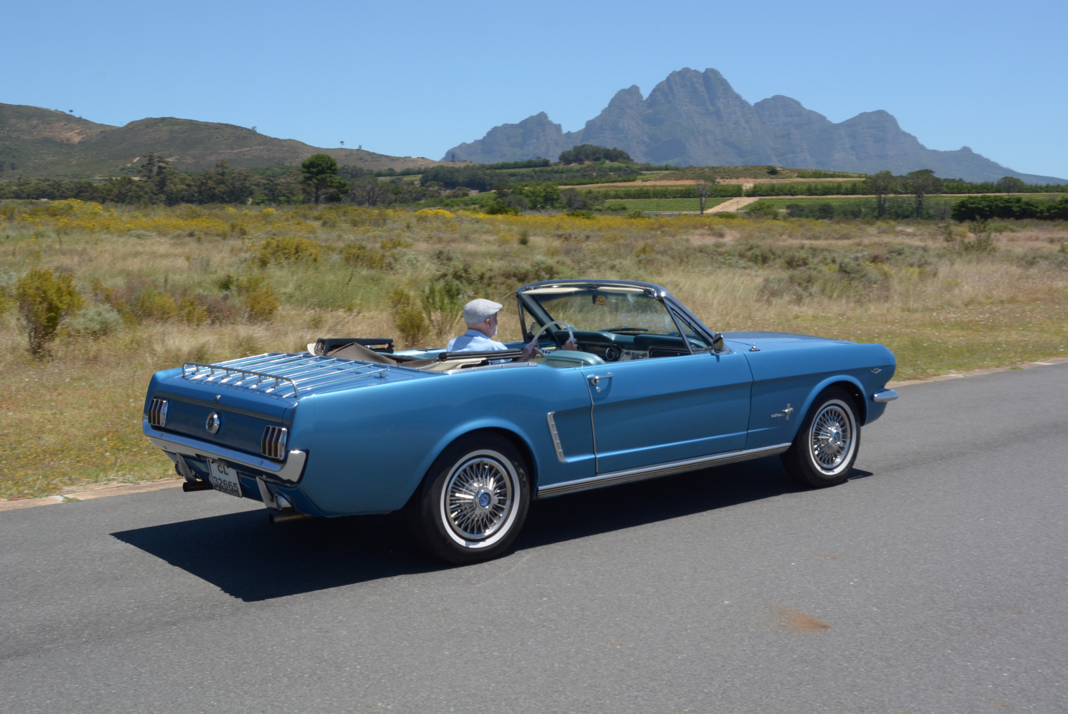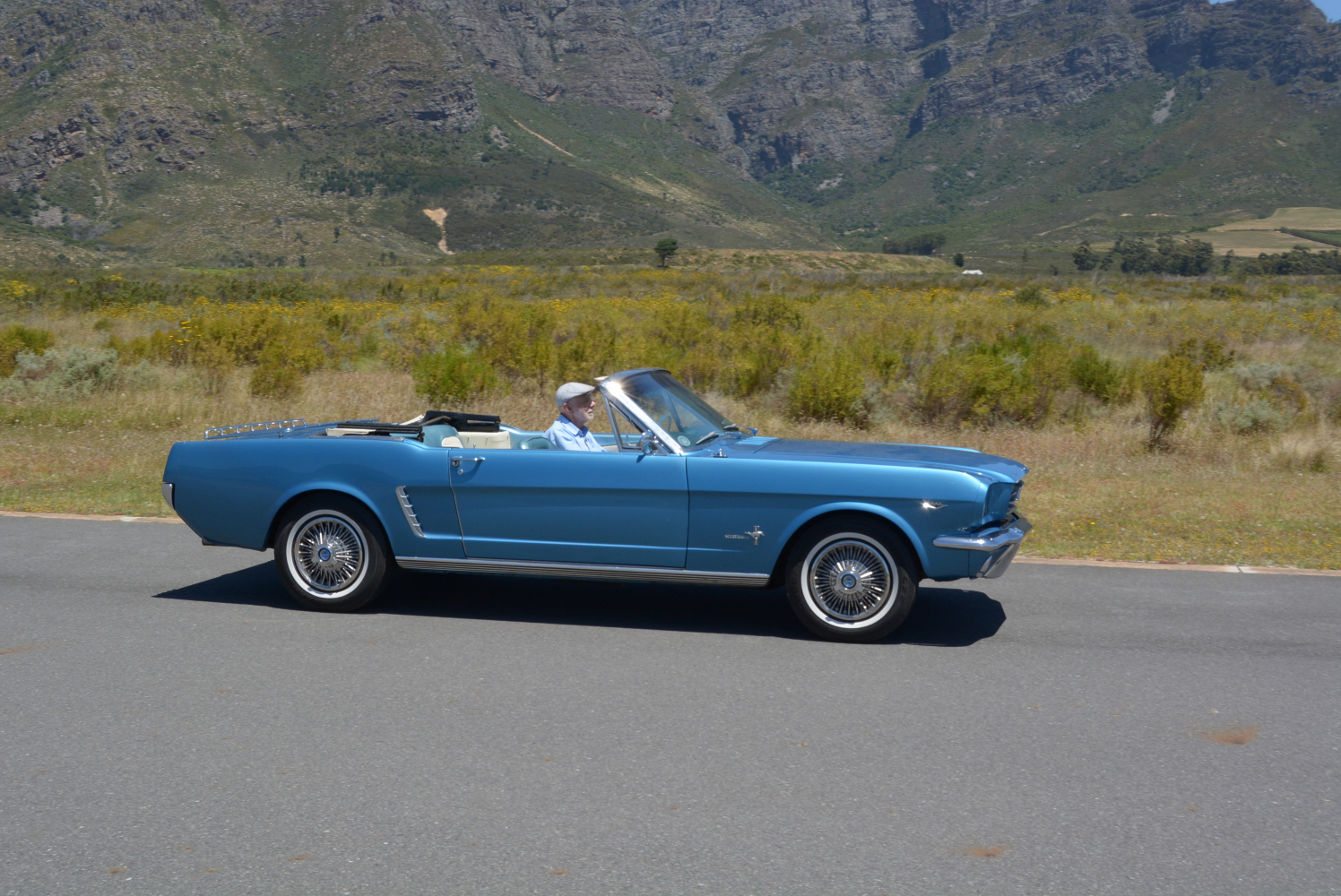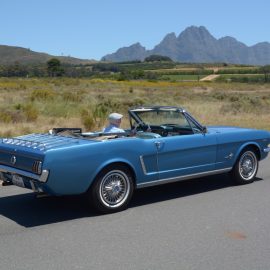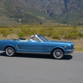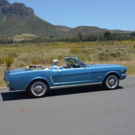 I have seen the Mustang described as “A poor man’s (Ford) Thunderbird for the working girl” and “A virility symbol to American youth in the 1960s”, neither of which has anything to do with me. When it was launched, I had just finished school and had started an apprenticeship, but I was one of the many who was wowed at the Mustang, and after watching Steve McQueen’s exploits in a GT in the iconic 1968 movie Bullitt, I became a fan for life. I have driven a few examples over the years, but with the sun shining above the Franschhoek mountains and FMM’s ’65 blue convertible standing in front of me, who was I to resist?