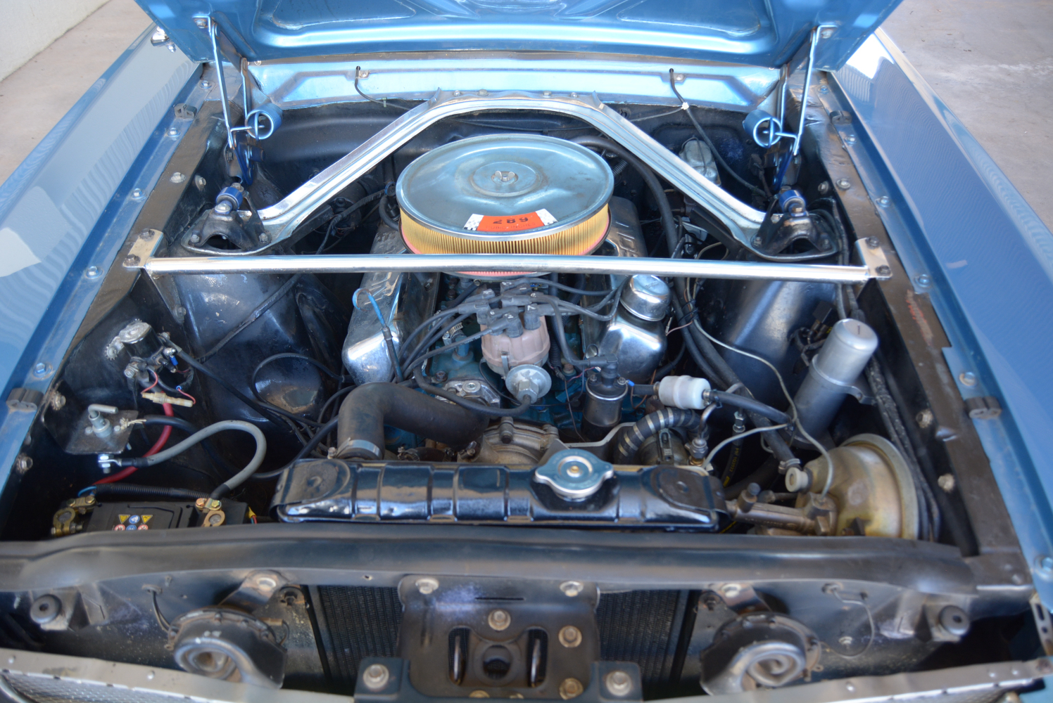 Several changes occurred in August at the start of the ‘normal’ 1965 model year. These cars are known as ‘late 65s’. At this time the engine line-up comprised a 200ci (3,3 litre) six-cylinder, a new 200 hp (150 kW) 289ci (4,7 litre) engine with a two-barrel carburettor as the base V8, a 225 hp (168 kW) four-barrel carb version, followed by an unchanged 289ci 271 hp (202 kW) HiPo equipped with a 4-barrel Autolite carburettor. The DC generator was replaced by a new AC alternator on all Fords.