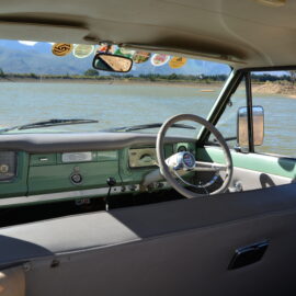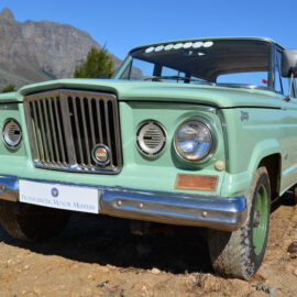 FMM’s Wagoneer is a weathered example – ‘patina on wheels’. The remnants of stickers on the nearside rear glass indicate that Joh and his family went here, there and everywhere – especially to game parks – in the Jeep, and it is easy to imagine their adventurous spirit, sitting high-up and master of all they surveyed thanks to the generous glasshouse and slim  pillars. Mind you, it must have been tiring travelling along because the ride is hardly cosseting and the steering is both slightly heavy and requiring arm-straining control of the big, leather-sheathed two-spoke wheel. Keeping the Wagoneer in a straight line demands constant correction – rutted off-road tracks are particularly demanding but the trick is not to fight it: slightly wider wheels than original are fitted.