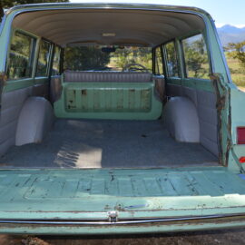 While not exactly luxurious, the Wagoneer has bench seats front and rear, a padded facia, good instrumentation with variable lighting, door-activated courtesy lights, windscreen washers and hard-pile carpeting. Overall sound proofing was said to be “of the highest order” but wind and road noise intrude as speed rises. Luggage space is given as 1,4 m3 and utility space an apartment-sized 2,8 m3! From 1964, air conditioning and seatbelts were optional, and later a brake booster was also offered as an extra. These were all standard on the Super Wagoneer introduced for the 1966 model year, together with power steering with a tilting wheel, electric tailgate operation, tinted glass and some other cosmetic features. The ’66 Wagoneer  changes included a couple of minor styling tweaks but most noticeably a new full-width grille, improved instrumentation, more comfortable seats, and a floor-mounted gear shift.
