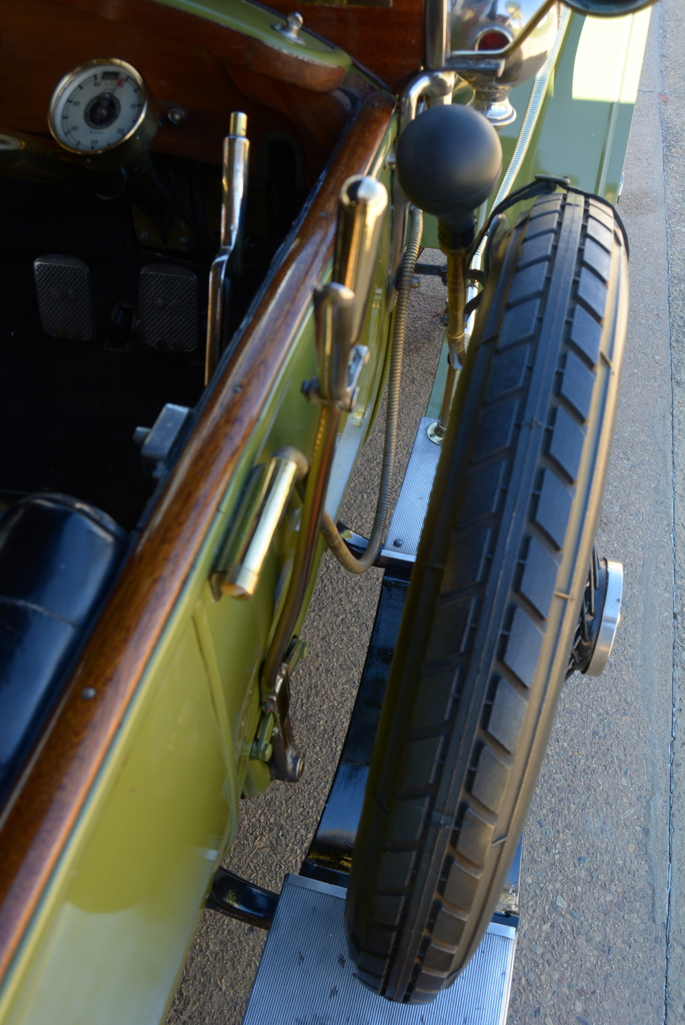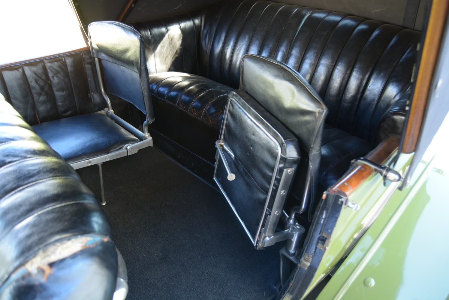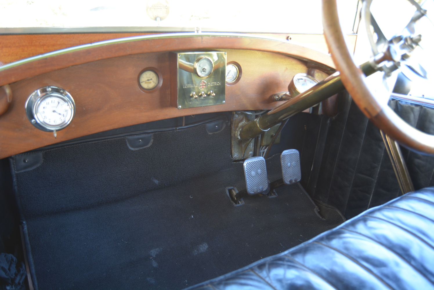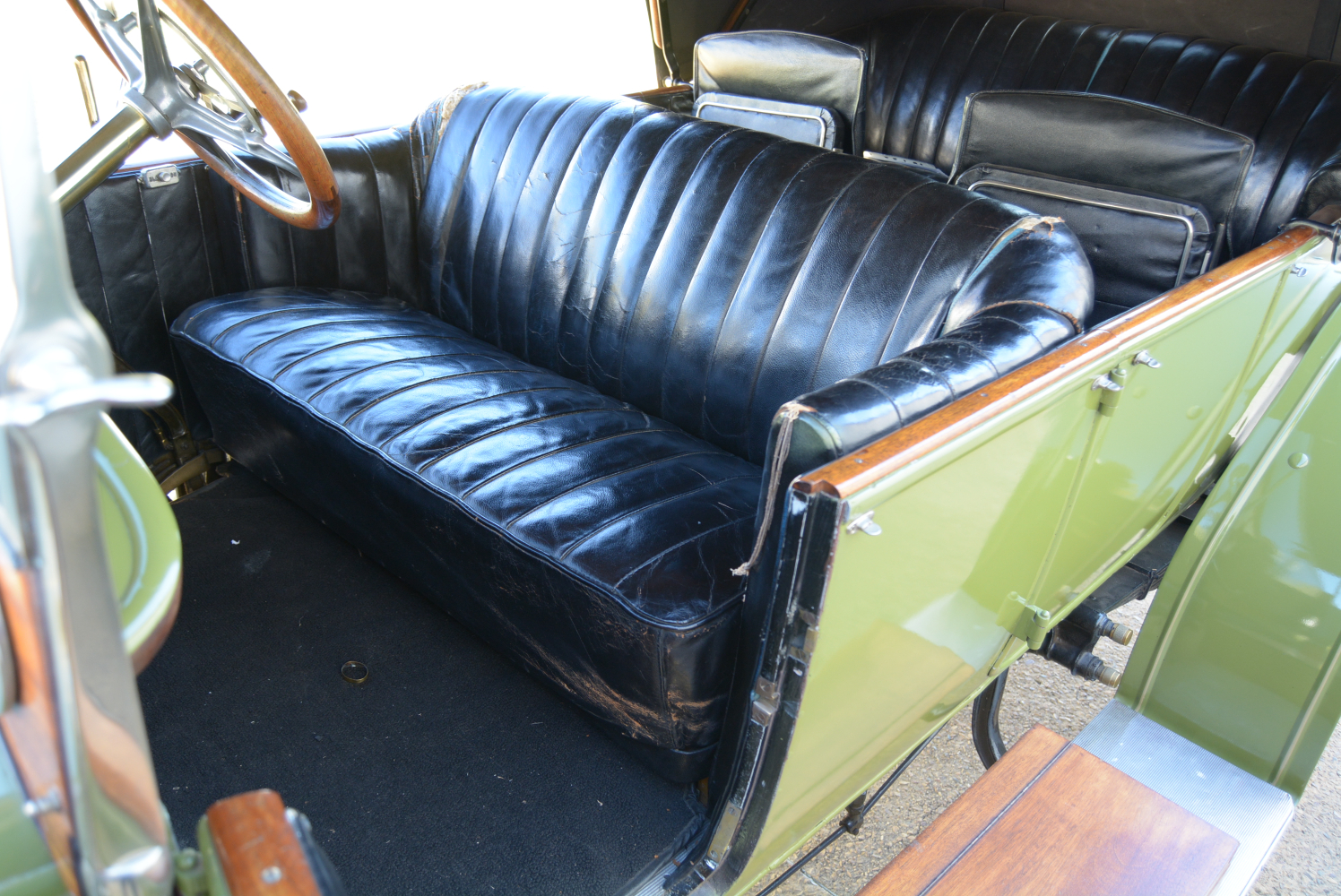 It takes quite a heave on the sturdy, wood-rimmed multi-function steering wheel (there is nothing new in the auto world…) to manoeuvre the car at anything up to brisk walking pace but the effort lessens noticeably as speed rises. Selecting fourth brings about a change of character, progress suddenly becoming a more relaxed affair affording the opportunity to take in the scenery and enjoy the sights, sounds and smells of travel, veteran style. Effective braking demands anticipation and a hefty shove on the right-hand pedal (the accelerator is in the middle). The mini-sofa-like front seat is comfortable while at the back there is a similar padded and pleated leather bench, along with a pair of taxi-like jump seats.