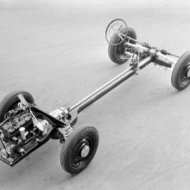 The 130H was powered by a 1 308 cm3 (a body plate states 1 299…) four-cylinder side-valve engine producing 19 kW at 3 400 r/min. It was mated with a three-speed plus overdrive transmission – of which more later – and was capable of realising a top speed of 92 km/h. Although Wagner is credited with the design of the tubular steel forked backbone chassis, the layout is said to have been inspired by Tatra’s celebrated Austrian engineer Hans Ledwinka. The 130H’s layout featured all-round independent suspension, with transverse leaf springs at the front, and coil springs/swing arms at the rear. Lever-arm shock absorbers were used. Unusual for this class of car, hydraulic four-wheel brakes were standard and provided strong retardation. The cross-members supporting the body were mounted below the chassis’ backbone for a lower centre of gravity. Although the ride quality was excellent, with two-thirds of the car’s mass over the rear axle line, the car’s handling proved to be poor…