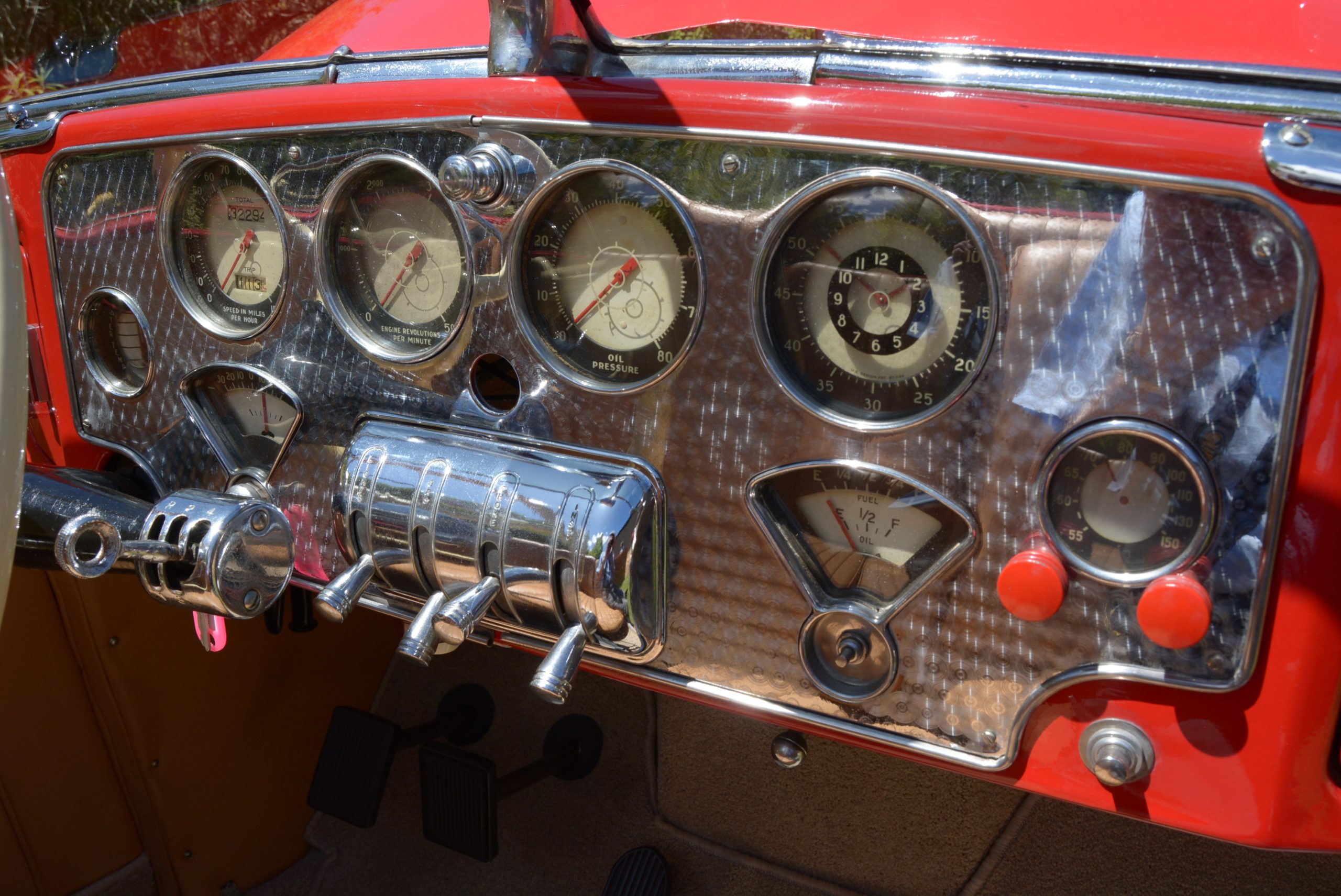 These Cords were also the first production cars to feature hidden/pop-up headlights, which were modified Stinson landing lights that disappeared into the fenders via dashboard hand cranks. Additionally, the radical new styling of its nose completely replaced the traditional radiator grille, in favour of horizontal louvres that curved all around the sides of the nose, earning the car’s styling the nickname of ‘coffin nose’. Accentuating its sleek, low-slung look, it also dispensed with running boards. Reportedly conceived as a Duesenberg and nearly devoid of chrome, the 810 had hidden door hinges and a rear-hinged bonnet rather than the side-opening type more usual at the time. It also featured a concealed lockable fuel filler door and variable-speed windshield wipers. Its engine-turned instrument panel housed complete instrumentation including a tachometer.