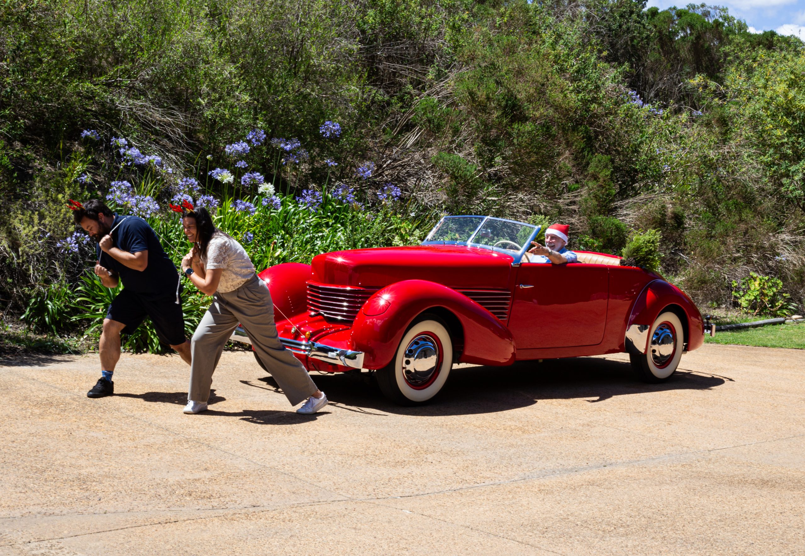 After a bit of photo fun for a feature heading shot, Wendy, JP and I went for a festive ride around L’Ormarins. JP had recently given the car a tune-up and it certainly lived up to expectations. It looks majestic – the gleaming red paintwork is almost eye-blistering – and once on the move it sounds absolutely glorious, the bark from the exhaust announcing performance with panache. In reality, top speed quotes claim figures between 150 and 160 km/h and a 0-96 km/h of around 20 seconds, which is hardly blistering pace by modern standards. But bowling along in a car that is simply drop-dead gorgeous far outweighs any speedo and stopwatch data.