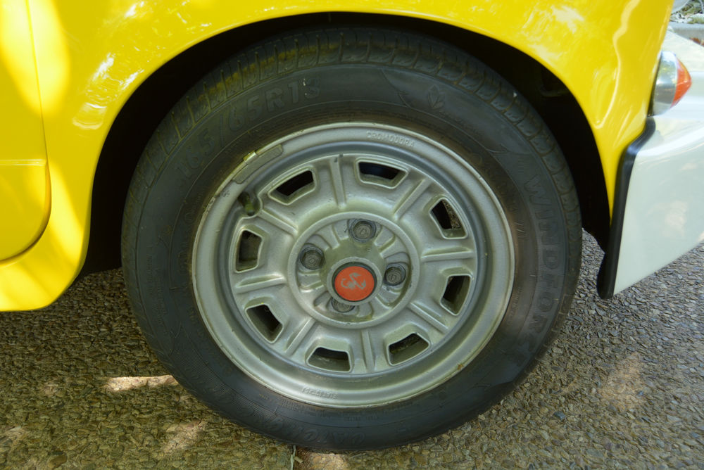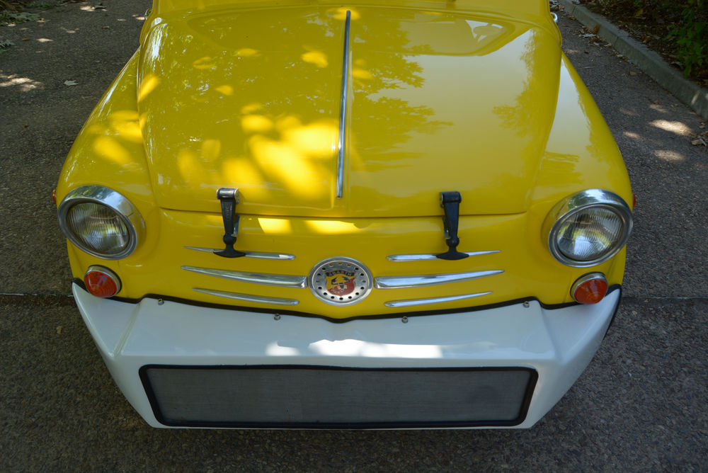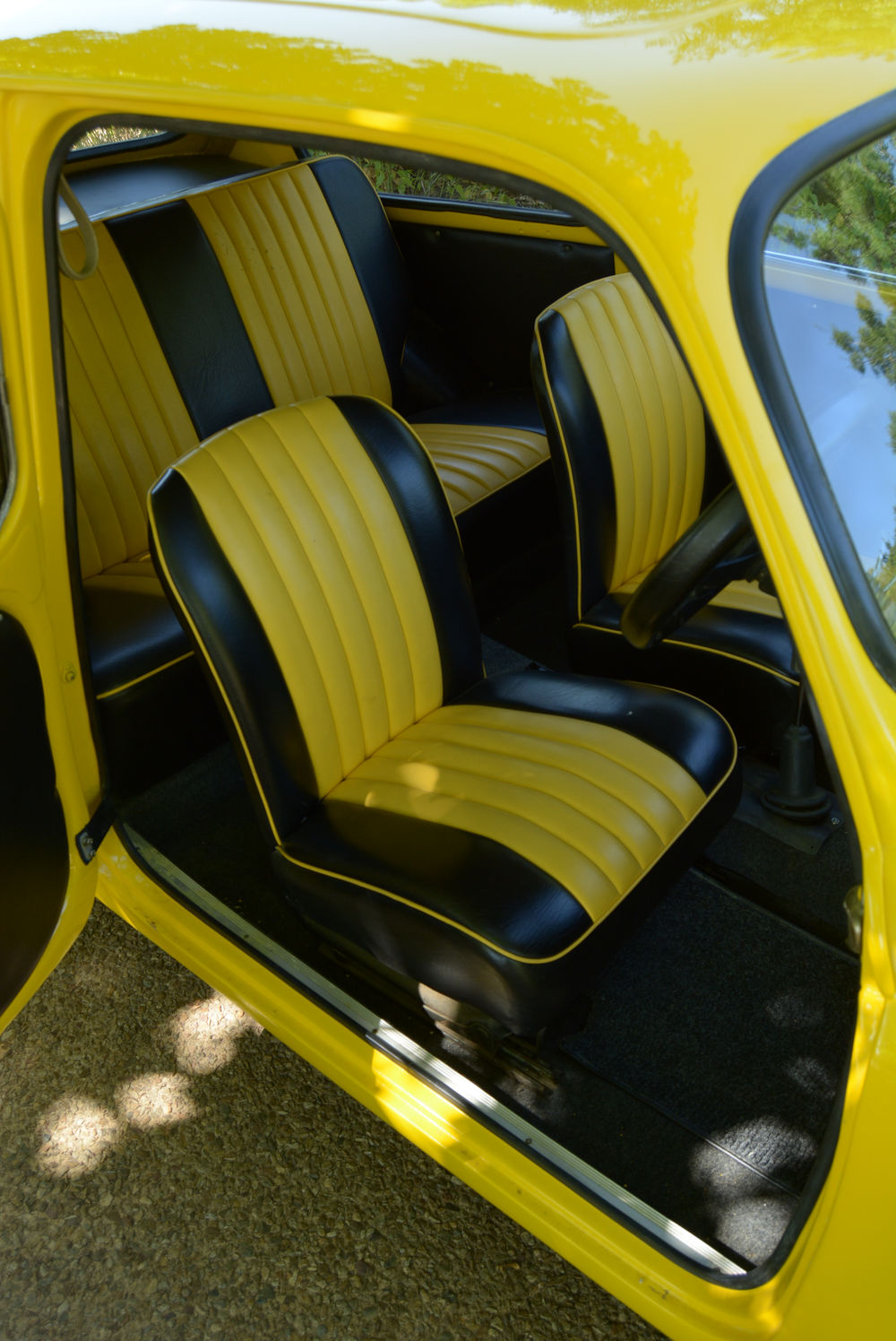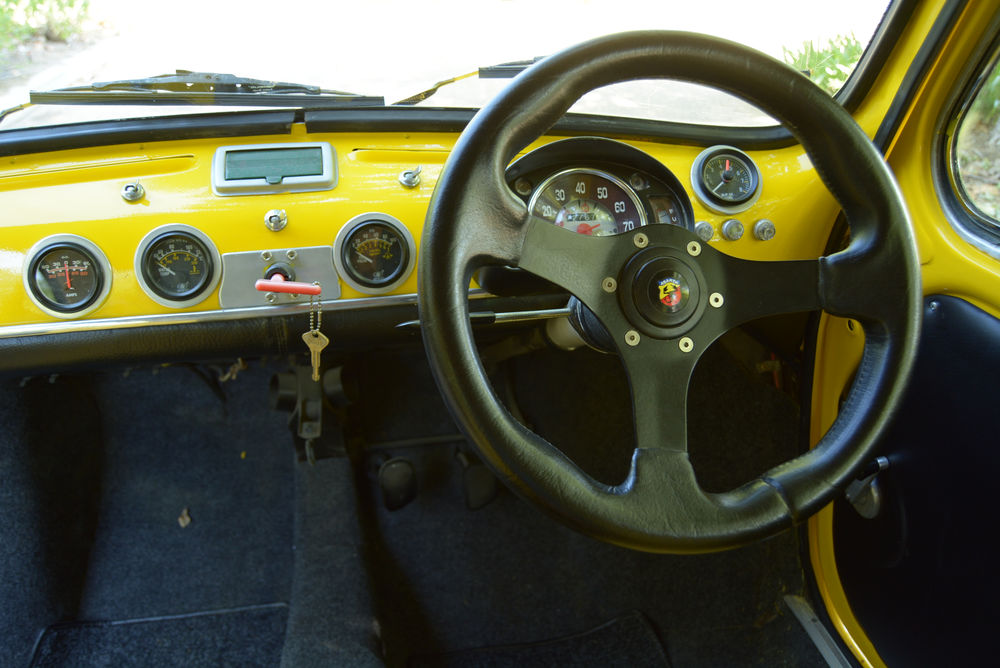 Stopping is not a problem as the car only weighs 600 kg and has been upgraded with 9-inch disc brakes from a Fiat 124 up front. The standard 600D drums are at the rear.