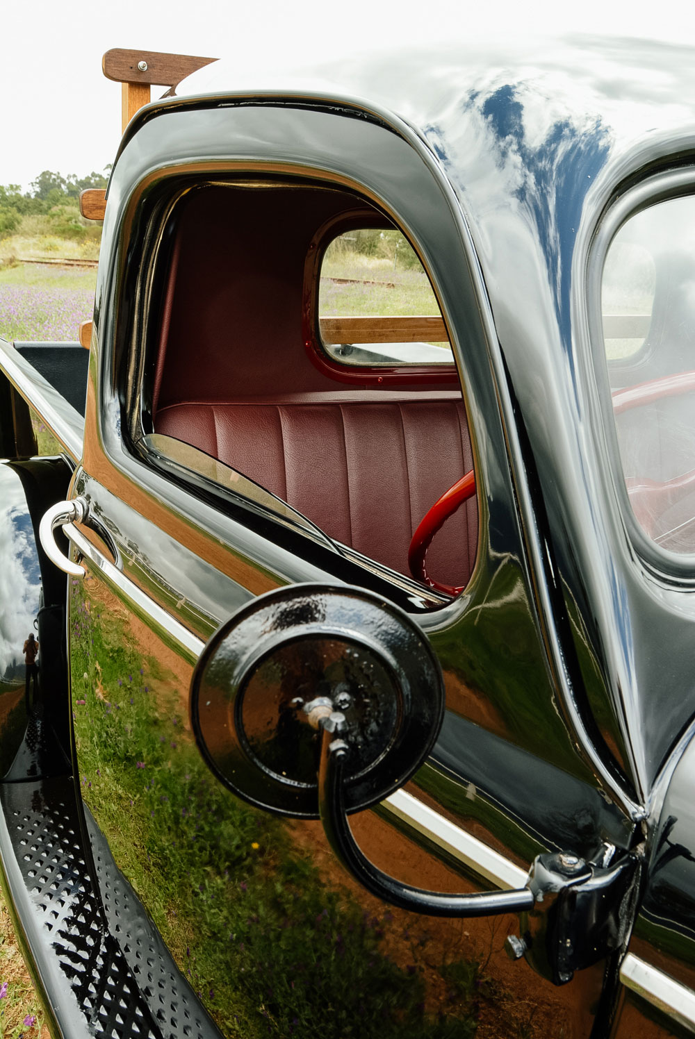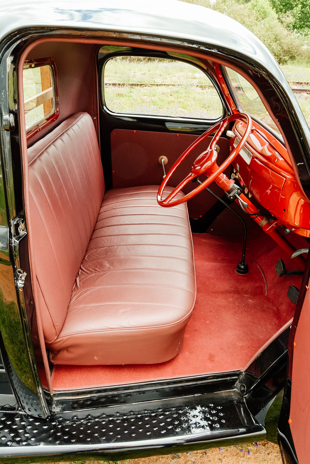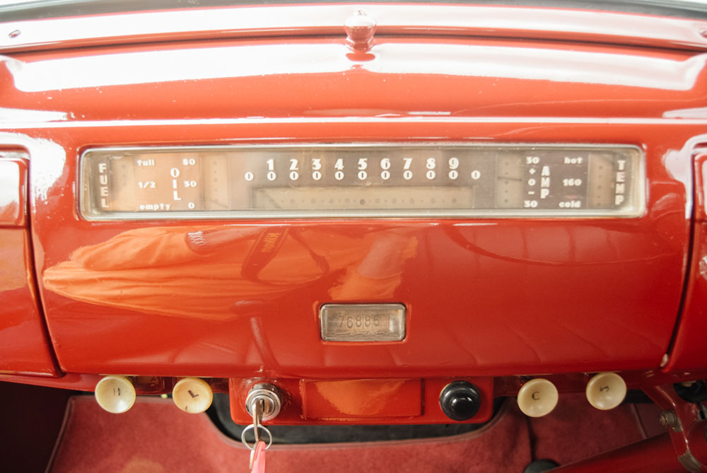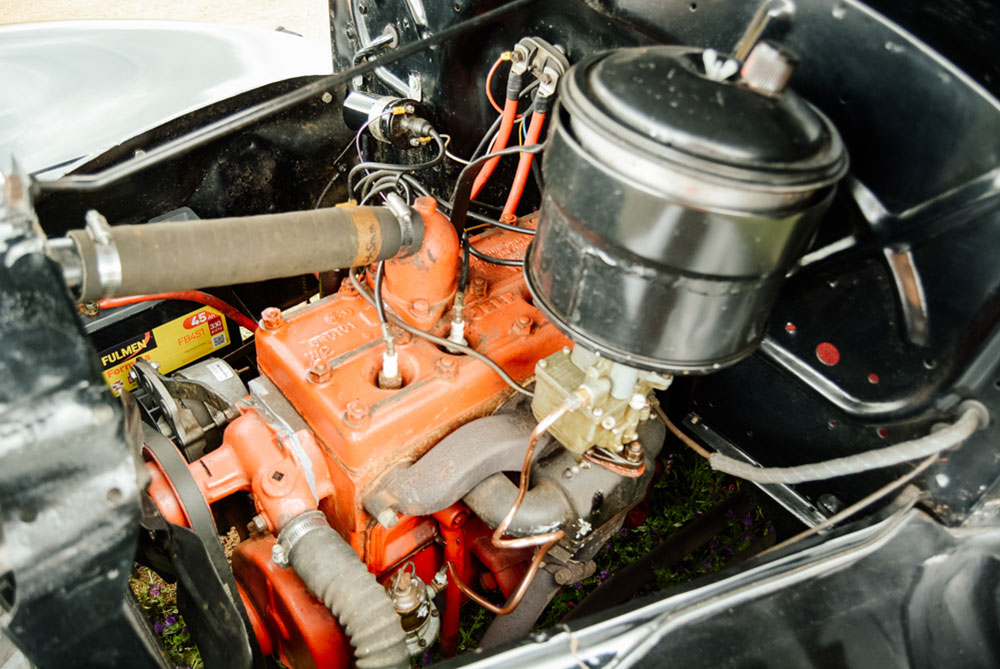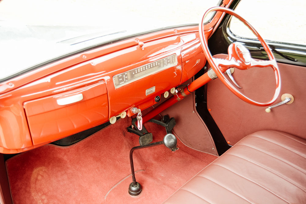 But FMM’s rare pick-up is to original spec and has an appealing workhorse look about it. A simple wood-strip cab protector is fitted, while stylish headlamp nacelles, chrome strips atop and along the bonnet and along the doors and white-wall tyres are the exterior’s only flashy items. What adds to the appeal are the disc wheels that are painted red to match the interior of the cab, in which everything is red – seat, carpet, door panels, dashboard, steering column and wheel. Oh, and so is the engine…