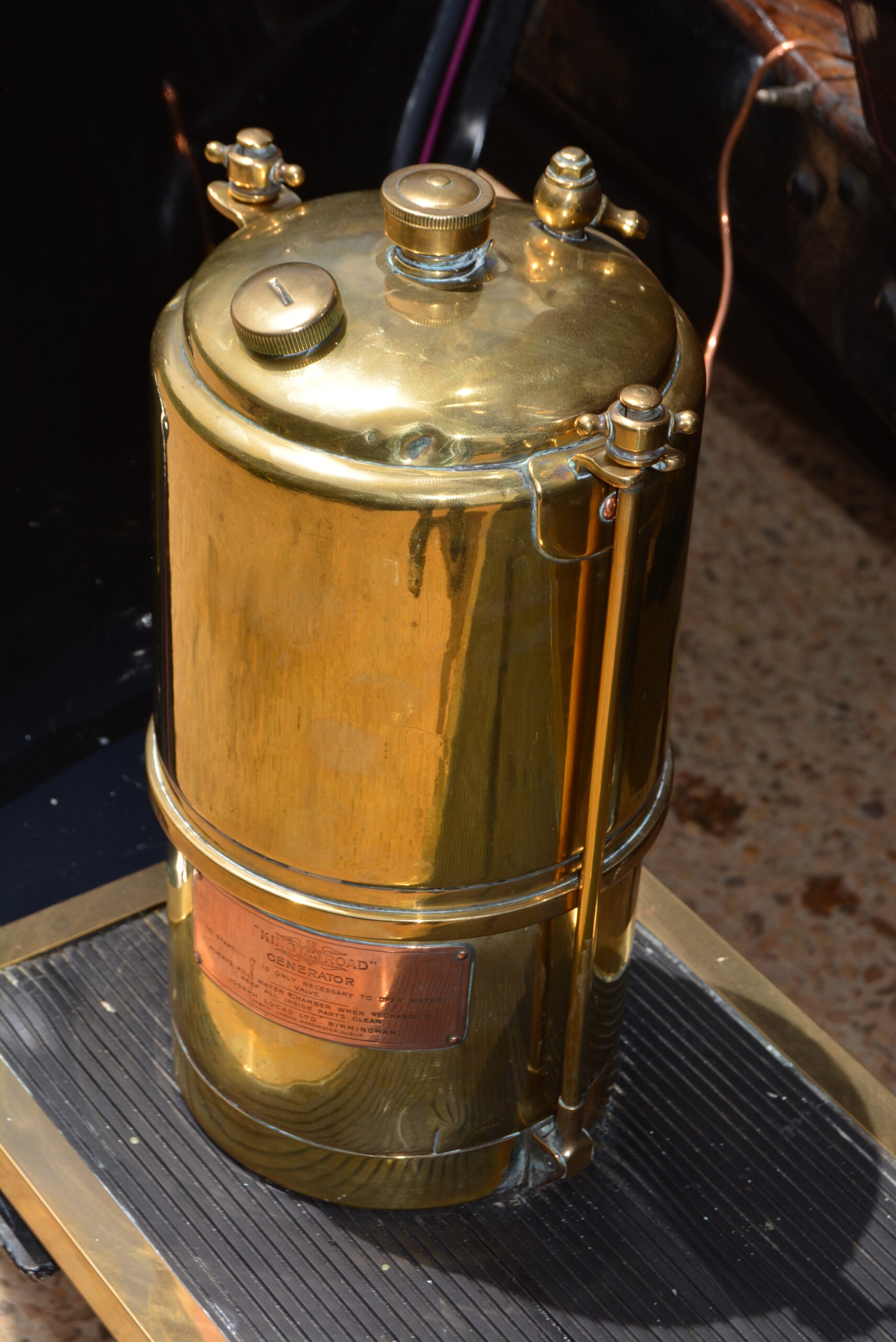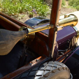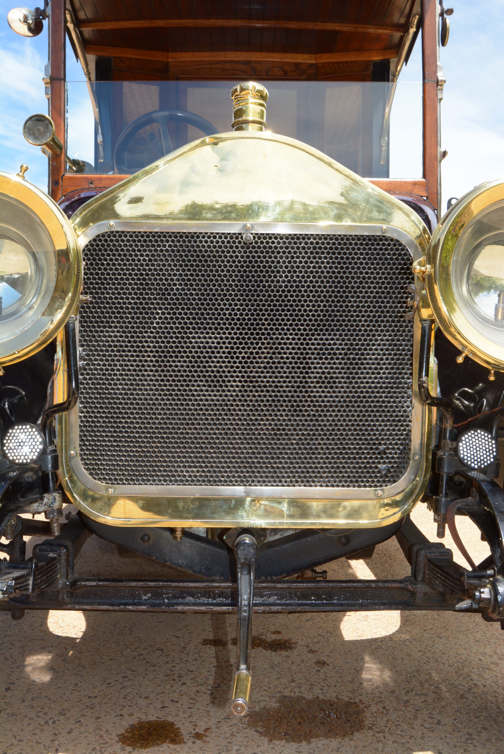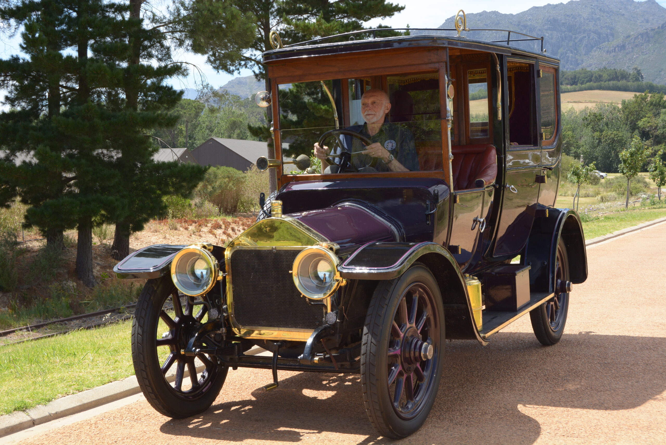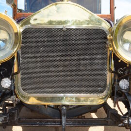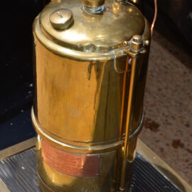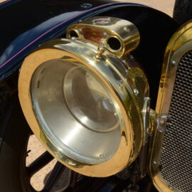 The thick-rimmed steering wheel is not overly large and steering effort not too heavy once on the move. Tyres are 815x105s mounted on wooden artillery wheels. The chassis has a wheelbase of 2 819 mm and weighs 762 kg. Suspension is by leaf springs all round and the foot brake operates on the drive shaft while the handbrake works on the rear wheels. The Lucas King of the Road headlamps were powered by a running board-mounted ‘generator’, a cylinder containing calcium carbide that when topped up with water produces acetylene, which ran through pipes to the headlamps where it could be ignited to produce light.