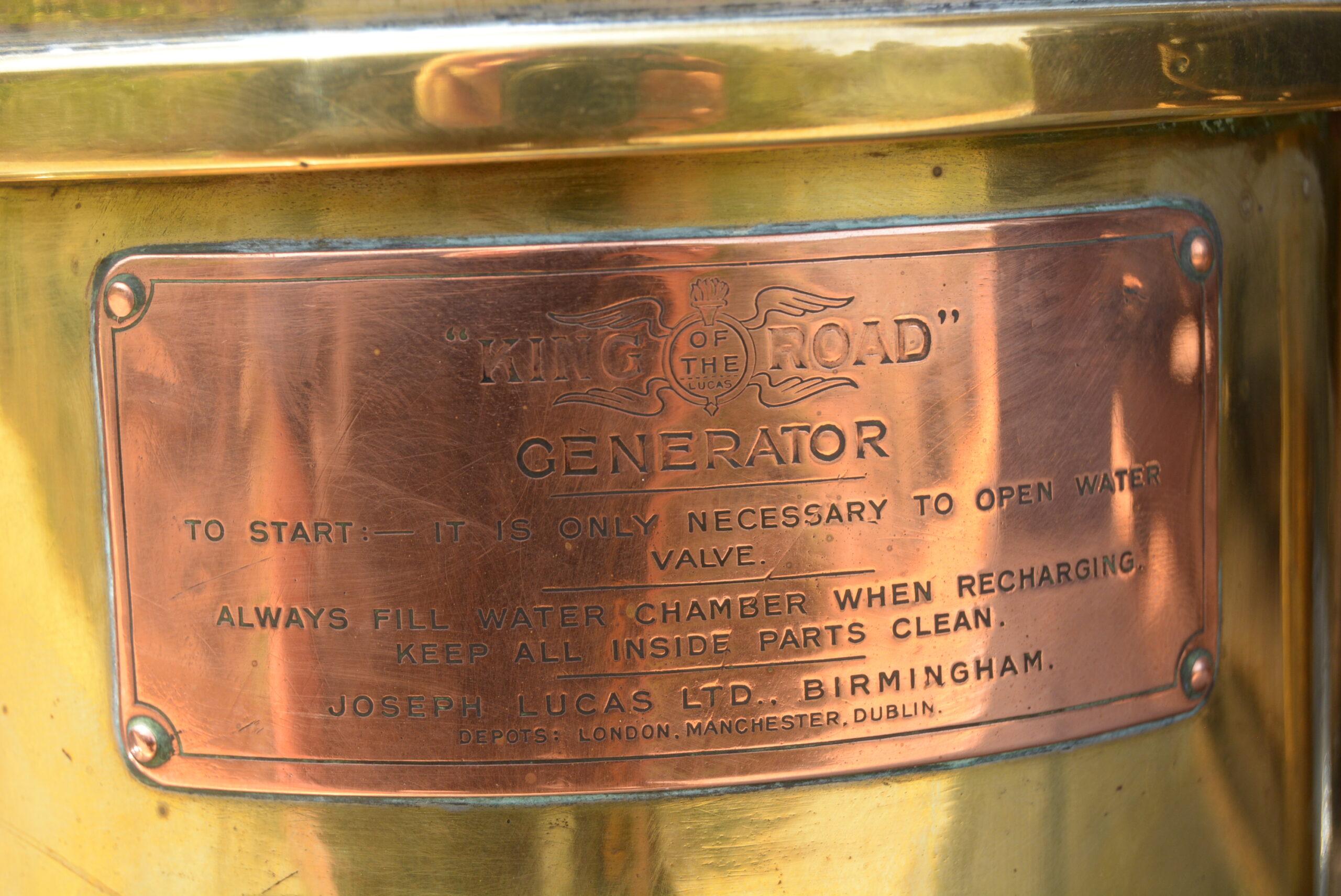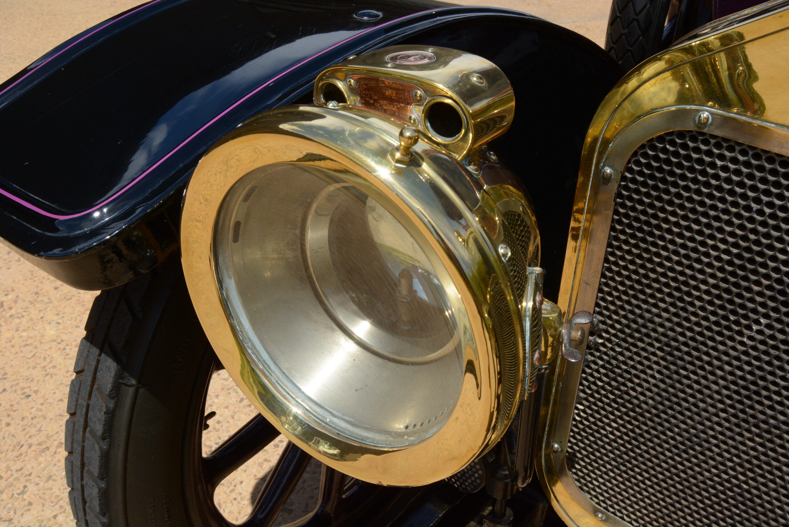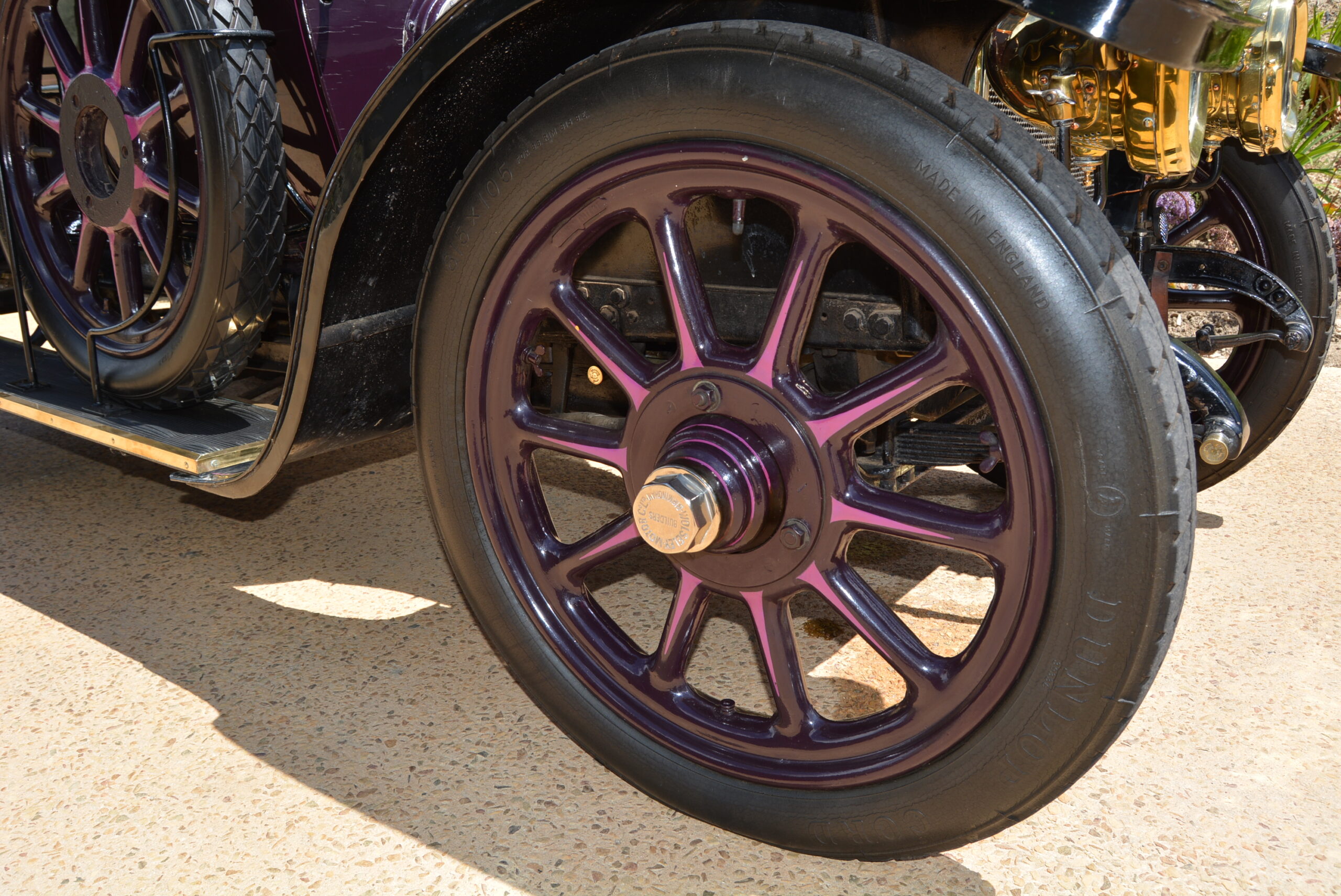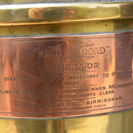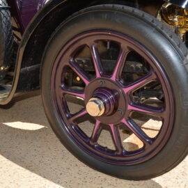 The thick-rimmed steering wheel is not overly large and steering effort not too heavy once on the move. Tyres are 815x105s mounted on wooden artillery wheels. The chassis has a wheelbase of 2 819 mm and weighs 762 kg. Suspension is by leaf springs all round and the foot brake operates on the drive shaft while the handbrake works on the rear wheels. The Lucas King of the Road headlamps were powered by a running board-mounted ‘generator’, a cylinder containing calcium carbide that when topped up with water produces acetylene, which ran through pipes to the headlamps where it could be ignited to produce light.