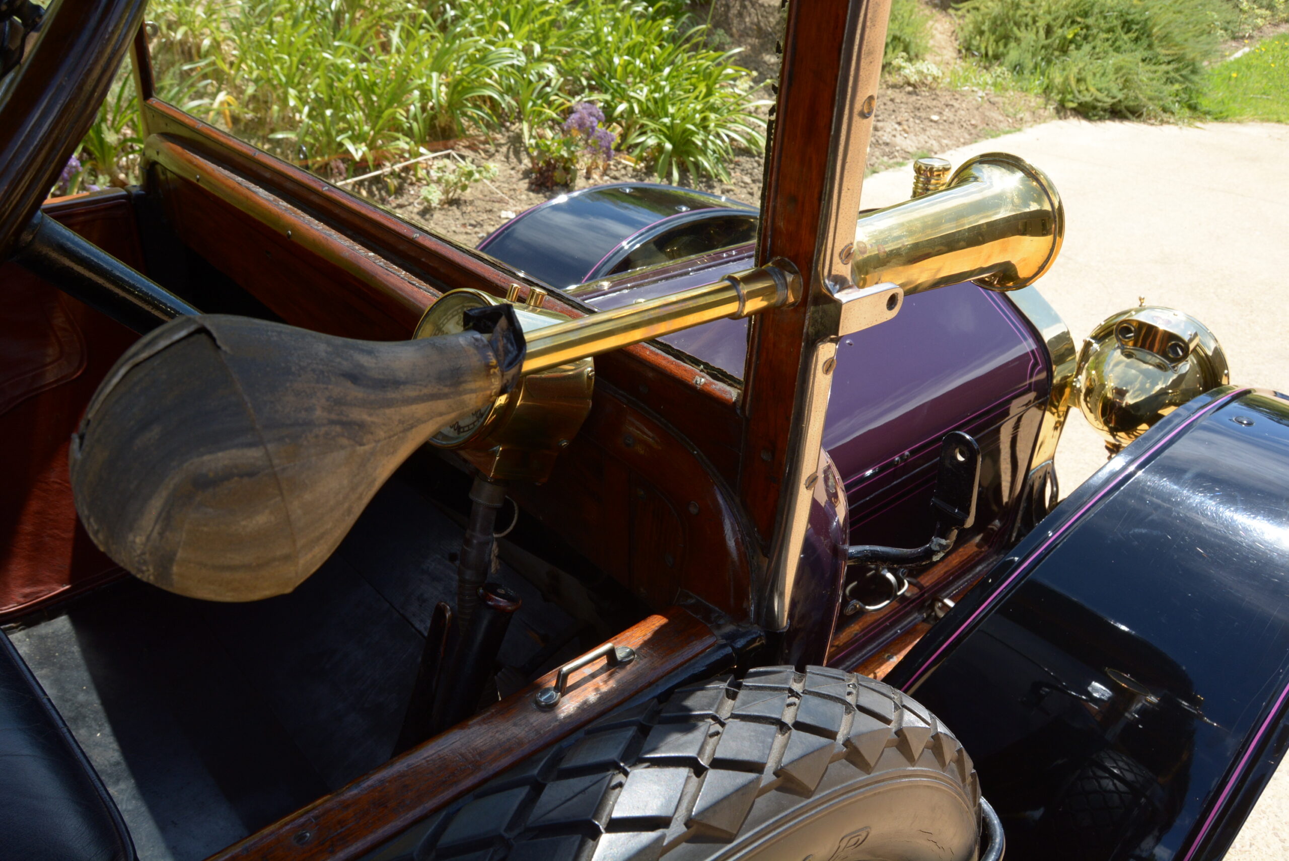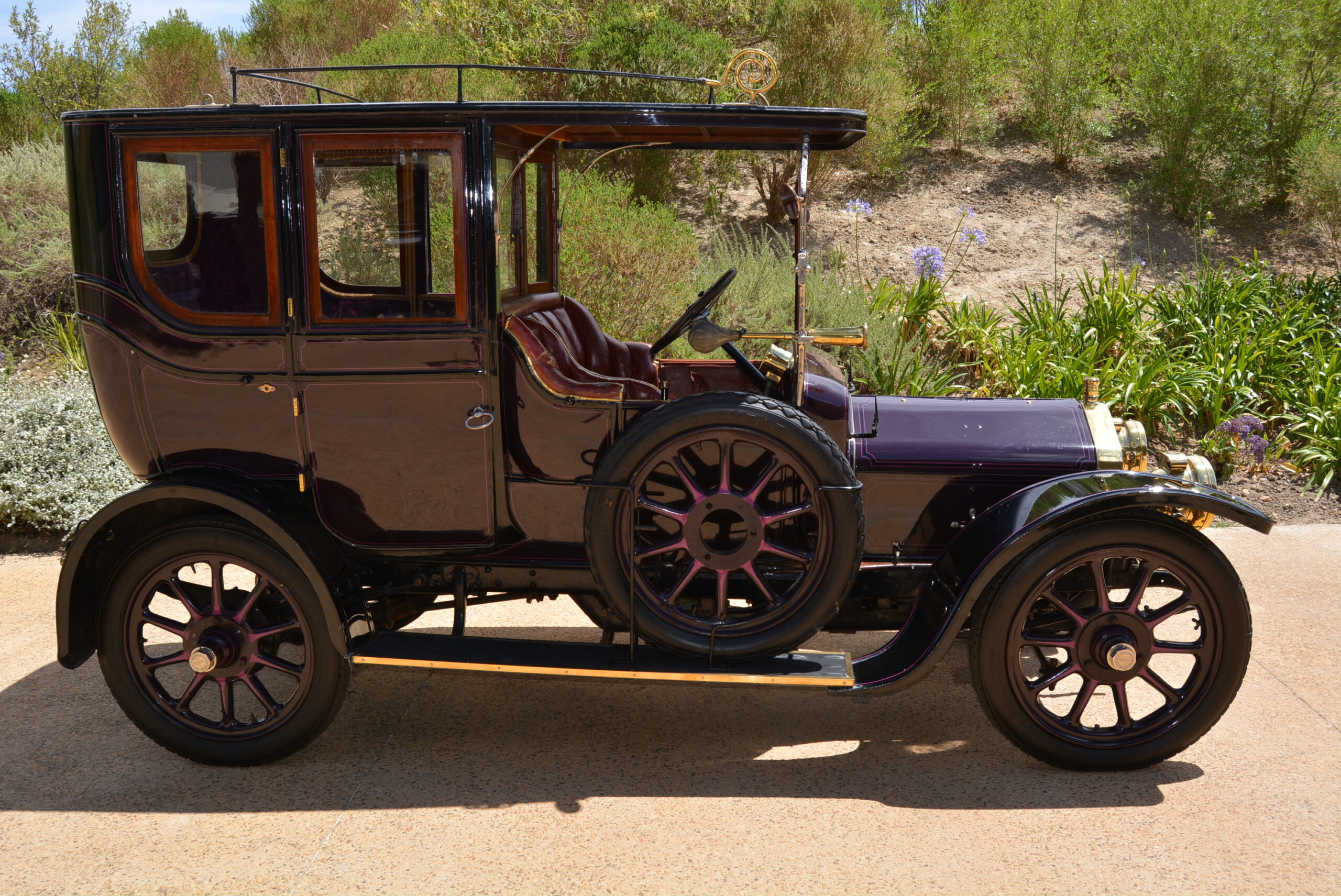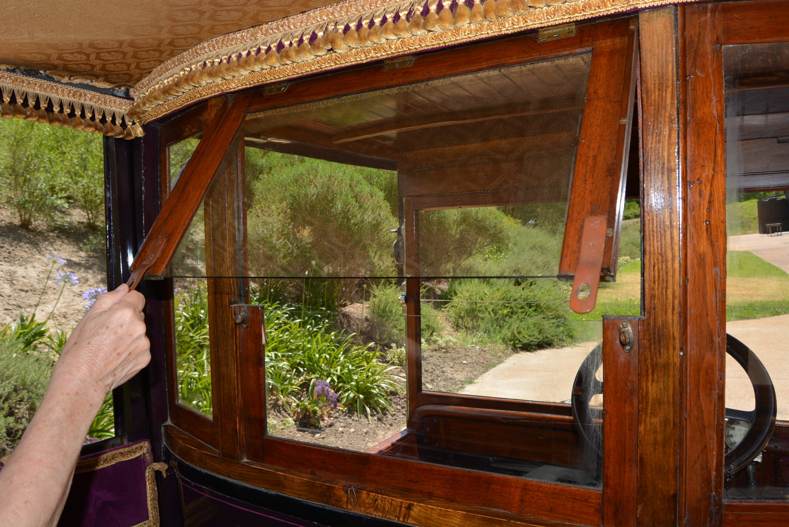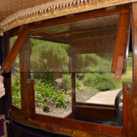 Although the roof extends to the top of the windscreen – it carries an ornate roof rack – the rear passenger compartment is separated by a split glass screen, the top half hinged so that conversation with the driver can be made. Upholstery is in rich cerise-coloured studded velvet, the hue matching the pin-striping on the purple painted bodywork. The windows drop down into the doors, old railway carriage-style, by means of a brocade-edged sash. An elegantly-patterned headlining edged with tassels adds to the classy ambience. Access to the front is from the passenger side only, and the sculpted dual seat is trimmed in leather.