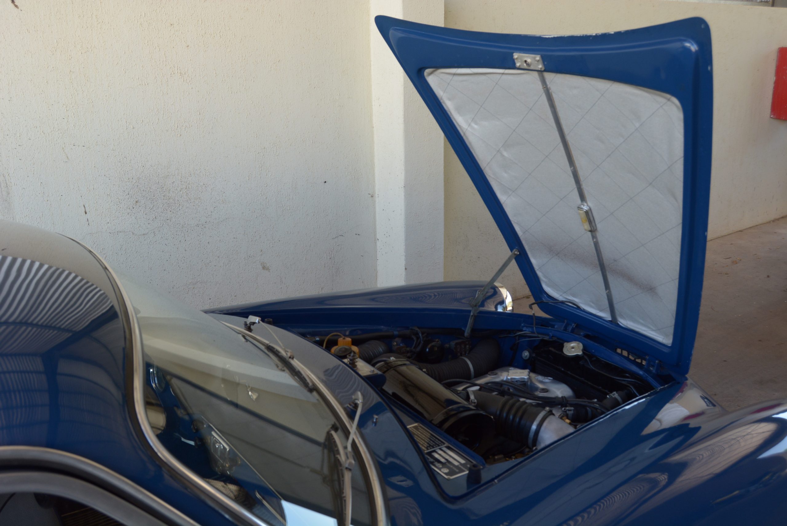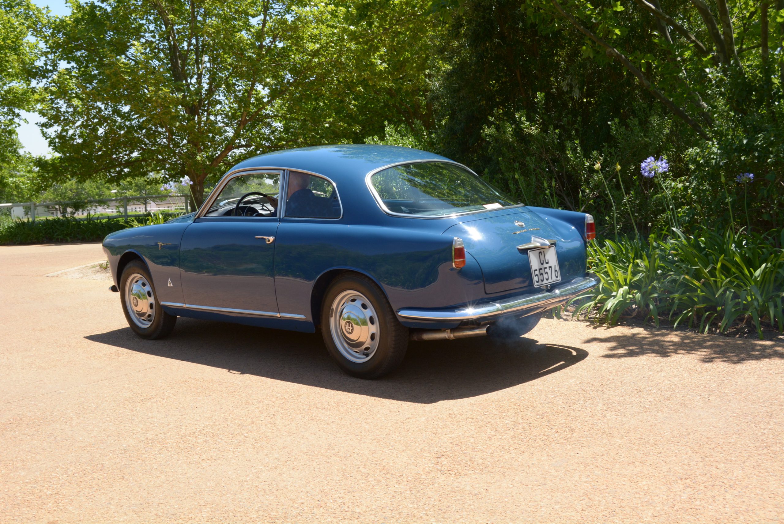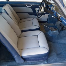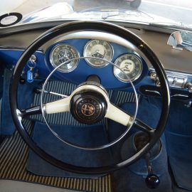 The Sprint Veloce was discontinued in 1957, probably in deference to the faster Sprint Zagato and SS models, although there is reason to suspect that the cost of producing a special lightweight body in addition to the ‘Normale’ body was not worth the outlay. So, the Confortevole (Comfortable) was introduced in late 1957 with the Veloce’s 66 kW engine in the Normale body. Other identifying features include aluminium window frames and wind-up windows, and underneath a Veloce-spec rubber buffer fitted to prevent the sump from hitting the frame rail. All Confortevoles had the same mechanical spec as the Veloce. The Franschhoek Motor Museum’s left-hand drive car featured here carries Alfa’s body number 750E AR1493E 06127 and left the line on 20 Feb 1958. Only 50 of these cars were produced, identified on the Bertone body number plate with an *A* suffix, in this case 655515*A*.