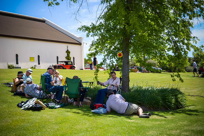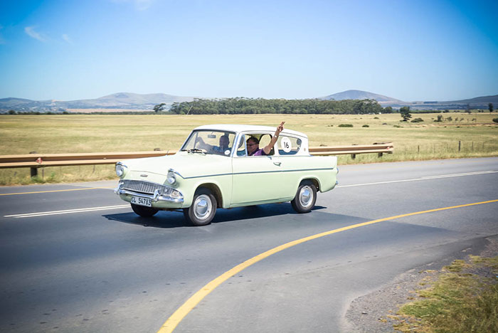 The 109 km route took competitors along Marine Drive (stopping off at Lagoon Beach Hotel car park to collect rolls from the Austin 7 bread van) through Paarden Eiland to Milnerton before heading onto Koeberg Road then through Richwood, over Durbanville Hills and out into the countryside along the R302 towards Klipheuwel. From there the crews crossed the N1 before turning towards Klapmuts and a stop at the Pot Belly restaurant and deli to collect picnic vouchers. Then it was back under the N1 before turning into Suid Agter Paarl Road, eventually picking up the R304 towards Franschhoek and the finish at FMM on the L’Ormarins estate. Once arrived, cars assembled at the quadrant and crews and supporters enjoyed their picnic hampers on the lawns in the 30-degree heat. Wine and refreshments were provided by FMM. Sadly, the Metcalf Chev did not make it, the FMM Anglia succumbed to a misfire and Alexander’s Lagonda suffered two punctures but only had one spare…