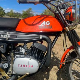 The AG175 has a basic, single-cylinder 2-stroke engine making 11,5 hp (8,6 kW) @ 6 500rpm and 12.8 N.m of torque, enough oomph to comfortably get you and a load up 30-deg inclines, and in 5th (top) gear on the open road, it could reach a speed of 90 km/h. The reed valve engine has an automated lubrication system to simplify any 2-stroke oiling issues. The AG has a double-cradle tubular steel frame as used on the CT1 and CT2 Yamaha trail bikes. Front suspension is by telescopic forks similar to the CT, with a 21-inch front wheel and cable-operated drum brake. The rear suspension features simple, dual, manually-adjustable shocks along with a steel tubular swing arm and an 18-inch wheel with a cable-operated drum brake.