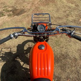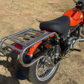 The single seat is broad and very comfortable, and is well placed ergonomically considering the bike’s vintage – clearly, there was consideration made for a long day in the saddle! The extras are all based on getting a job done i.e. the loading of equipment or even animals … yes, livestock and pets! The 1977 sales brochure states, “The extra-large carrier is strong enough to carry tools and equipment – even a large sheep-dog”. Standard on all AG models were the unmistakable sable grip protectors for riding and navigating through gates, rocky ravines or wooded areas etc. The front carrier was originally intended to carry smaller items such as books, maps and charts. But even with all these extra carriers and guards, the total dry weight of the motorcycle is only 108 kg, a manageable weight to pick up should the motorcycle fall.