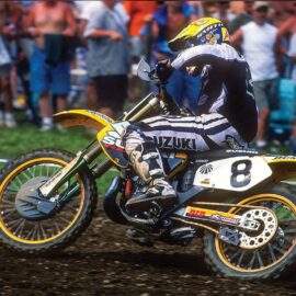 This allowed Greg to pursue his original dream of heading to the USA to race in the AMA motocross series. He now had the backing of Suzuki to accomplish this dream. As world champ, Greg used his influence to set up a team in the USA, which included Roger da Costa and Ian Harrison. But the dream was not sweet – his campaign started off badly and Supercross proved to be a bigger mountain to climb than he thought. Things did not go well. Greg also found the 1996 Suzuki RM250 to be one of the worst machines he had encountered and he had to push himself to keep up with the competition, often overdoing it, which accounted for a large number of accidents, falls and injuries. Later that year he finally won his first event, which restored his confidence.